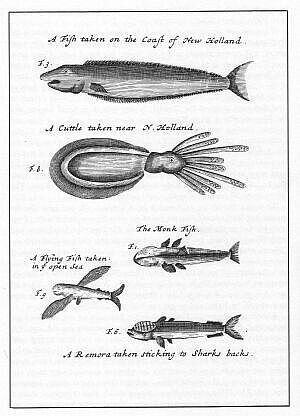 FIGURE 1: THE MONKFISH. FIGURE 3: A FISH TAKEN ON THE COAST OF NEW HOLLAND. FIGURE 6: A REMORA TAKEN STICKING TO SHARKS BACKS. FIGURE 8: A CUTTLE TAKEN NEAR NEW HOLLAND. FIGURE 9: A FLYING-FISH TAKEN IN THE OPEN SEA.