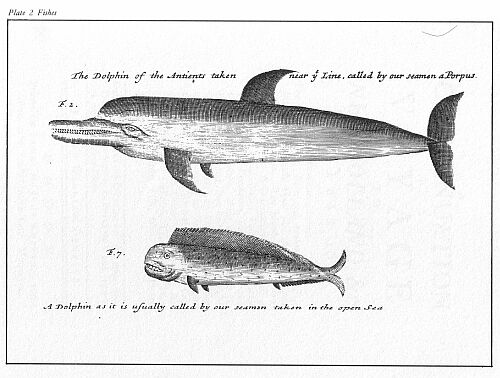 FIGURE 2: THE DOLPHIN OF THE ANCIENTS TAKEN NEAR THE LINE, CALLED BY OUR SEAMEN A PORPOISE. FIGURE 7: A DOLPHIN AS IT IS USUALLY CALLED BY OUR SEAMEN TAKEN IN THE OPEN SEA.