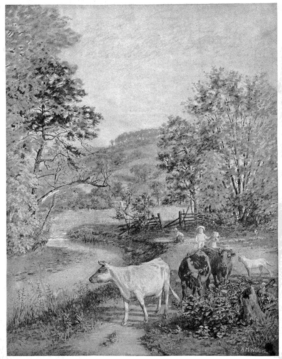 But Mr. Willard first became known to the public as a painter of children. His first pictures to attract attention of the public were a pair called “Pluck,” representing a homemade cart occupied by some little folks, and drawn by a dog in hot pursuit of a rabbit. These made their advent twenty odd years ago when the chromo was in its glory, and found their way into thousands of homes.