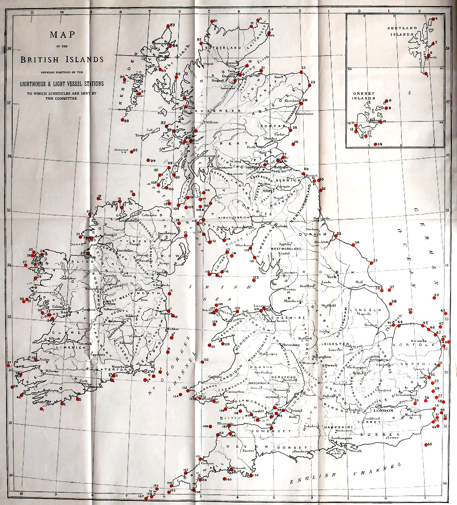 The usual schedules were sent to twenty-seven stations. Thirteen stations on the East Coast of Scotland have returned forty-eight schedules. Isle of May gives heaviest returns with nineteen schedules. Pentland Skerries follows with eleven. Bell Rock again is next in importance.