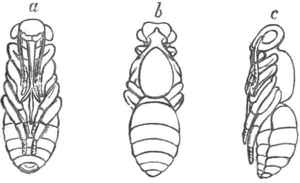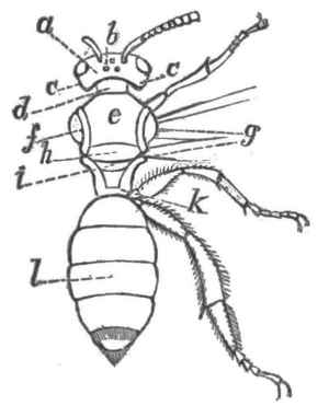 Most of the Hymenoptera further possess some kind of an ovipositor,—of course restricted to the females,—varying considerably in the different families. This is sometimes external, but is often seated within the apex of the abdomen, whence it can be protruded for the purpose of depositing the egg in its right nidus. In our insect this organ is converted into a weapon of defence 18and offence, and forms a sting, supplied by glands with a very virulent poison, which the bee can inject into the wound it inflicts. It is not certain that this organ is used by the bee as an ovipositor, although it is evident it is its analogue. This brief description of the essential peculiarities of the family will, for the present, suffice. In the notice of the imago, I shall enlarge upon the general structure, and then particularize those portions of it which may facilitate further progress.