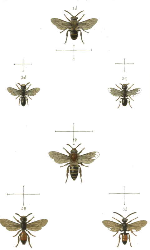 The way in which the bees execute this object and design of nature, and to which they, more evidently than any other insects, are called to the performance, is shown in the implanted instinct which prompts them to seek flowers, knowing, by means of that instinct, that flowers will furnish them with what is needful both for their own sustenance, and for that of their descendants. Flowers, to this end, are furnished with the requisite attractive qualifications to allure the bees. Whether their odour or their colour be the tempting vehicle, or both conjunctively, it is scarcely possible to say, but that they should hold out special invitation is requisite to the maintenance of their own perpetuity. This, it is 12supposed, the colour of flowers chiefly effects by being visible from a distance. Flowers, within themselves, indicate to the bees visiting them the presence of nectaria by spots coloured differently from their petals. This nectar, converted by bees into honey, is secreted by glands or glandulous surfaces, seated upon the organs of fructification; and nature has also furnished means to protect these depositories of honey for the bees, from the intrusive action of the rain, which might wash the sweet secretion away. To this end it has clothed the corollæ with a surface of minute hairs, which effectually secures them from its obtrusive action, and thus displays the importance it attaches to the co-operation of the bees. That bees should vary considerably in size, is a further accommodation of nature to promote the fertilization of flowers, which, in some cases, small insects could not accomplish. Many plants could not be perpetuated, but for the agency of insects, and especially of bees; and it is remarkable that it is chiefly those which require the aid of this intervention that have a nectarium, and secrete honey. By thus seeking the honey, and obtaining it in a variety of ways, bees accomplish this great object of nature. It often, also, happens that flowers which even contain within themselves the means of ready fructification cannot derive it from the pollen of their own anthers, but require that the pollen should be conveyed to them from the anthers of younger flowers; in some cases the reverse takes place, as for instance, in the Euphorbia Cyparissias, wherein it is the pollen of the older flower which, through the same agency, fertilizes the younger. Although many flowers are night-flowers, yet the very large majority expand during the day; but to meet the requirements of those 13which bloom merely at night, nature has provided means by the many moths which fly only at that time, and thus accomplish what the bees perform under the eye of the sun. Here insects are again subservient to the accomplishment of this great act; for the petals of even the flowers which open in the night only are usually highly coloured, or where this not the case, they then emit a powerful odour, both being means to attract the required co-operation. But of course our clients have nothing to do with these night-blooming flowers, as I am not aware of a single instance of a night-flying bee; nor are they on the wing very late in the evening, being before sunset, already in their nidus. In those occasional cases where the nectarium of the flower is not perceptible, if the spur of such a flower which usually becomes the depository of the nectar that has oozed from the capsules secreting it, be too narrow for the entrance of the bee, and even beyond the reach of its long tongue, it contrives to attain its object by biting a hole on the outside, through which it taps the store. The skill of bees in finding the honey, even when it is much withdrawn from notice, is a manifest indication of the prompting instinct which tells them where to seek it, and is a matter of extreme interest to the observer, for the honey-marks—the maculæ indicantes—surely guide them; and where these, as in some flowers, are placed in a circle upon its bosom, as the mark upon that of Imogen, who had—