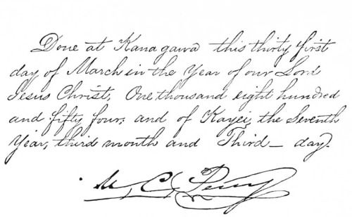 Unable to thank all who have so kindly aided me, I must especially mention with gratitude the Hon. Wm. E. Chandler and W. C. Whitney, Secretaries of the United States Navy Department, Prof. J. R. Soley, chief clerk T. W. Hogg and clerk J. Cassin, for facilities in consulting the rich archives of the United States Navy; Admiral D. D. Porter and Rear-Admirals John Almy, D. Ammen, C. R. P. Rodgers, T. A. Jenkins, J. H. Upshur, and Captain Arthur Yates; the retired officers, pay director J. G. Harris, Lieut. T. S. Bassett and Lieut. Silas Bent formerly of the United States Navy, for light on many points and for reminiscences; Messrs. P. S. P. Conner, John H. Redfield, Joseph Jenks, R. B. Forbes, Chas. H. Haswell, Joshua Follansbee, and the Hon. John A. Bingham, for special information; the daughters of Captains H. C. Adams, and Franklin Buchanan, for the use of letters and for personalia; Rev. E. Warren Clark, Miss Orpah Rose, Miss E. B. Carpenter and others in Rhode Island, for anecdotes of Perry’s early life; the Hon. Gideon Nye of Canton; the Rev G. F. Verbeck of Tōkiō; many Japanese friends, especially Mr. Inazo Ota, for documents and notes; and last, but not least, the daughters of Commodore M. C. Perry, Mrs. August Belmont, Mrs. R. S. Rodgers, and especially Mrs. George Tiffany, who loaned letters and scrap-books, and, with Mrs. Elizabeth R. Smith of Hartford, furnished much important personal information. Among the vanished hands and the voices that are now still, that have aided me, are those of Rear-Admirals Joshua R. Sands, George H. Preble, and J. B. F. Sands, Dr. S. Wells Williams, Gen. Horace Capron, and others. A list of Japanese books consulted, and of Perry’s autograph writings and publications, will be found in the Appendix; references are in footnotes.