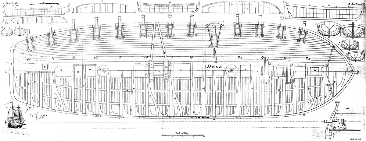 51. The same gentleman observes, that a ship of two decks, such as are generally all those of the third and fourth rates, cannot be so strongly connected as one that is furnished with three: a vessel pierced for 15 guns on one side of her deck must necessarily be very long, and is sometimes apt to droop at the two ends; or, in the sea-phrase, to break her back under the enormous weight of her artillery.