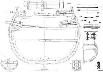 24. The iron chambers are ten inches long, and 3.5 in diameter. They are breeched against a piece of wood fixed across the ports, and let into another a little higher. When loaded, they are almost filled with corn-powder, and have a wooden tompion well driven into their muzzles. They are primed with a small piece of quick-match thrust through their vents into the powder, with a part of it hanging out. When the ports are blown open by means of the iron chambers, the port-lids either fall downward, or are carried away by the explosion.