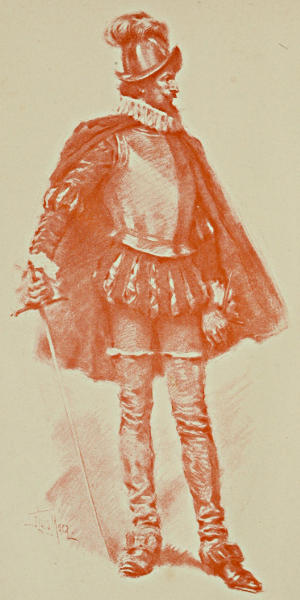 Toward this pair the eyes of a group across the room were frequently directed. Among the latter company one figure was particularly noticeable, being that of a very young man, of medium size, bearing himself not ungracefully, and wearing a riding-cloak thrown off over one shoulder above an inconspicuous doublet of dark red satin, which, together with his silken hose and velvet, befeathered hat, revealed the civilian. The man nearest to him, many years his senior, was, by name, Sir Walter St. Magil; by profession, unmistakably a soldier. He, too, was of medium height and aristocratic carriage, though with a face rendered exceedingly ill-appearing by a cast in one of his eyes which drew the pupil so far in toward the nose as to leave but a half of it visible.