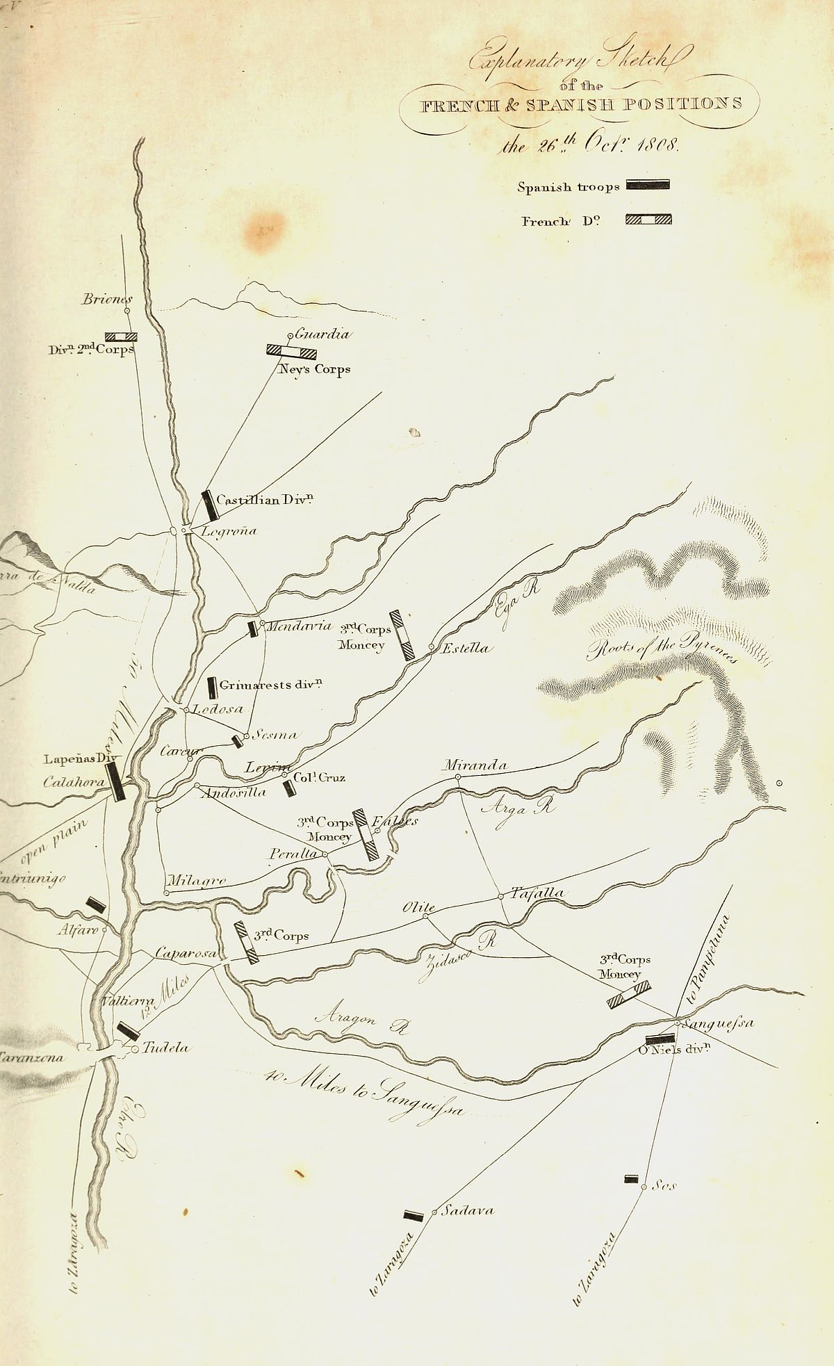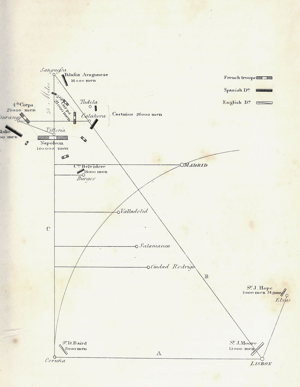 [30] On ne comprend pas dans ces celculs les garnisons de Pampelune, St. Sebastien, Vittoria, Tolosa, Bilbao, &c.: il n’est pas question non plus de l’armée de Catalogne.