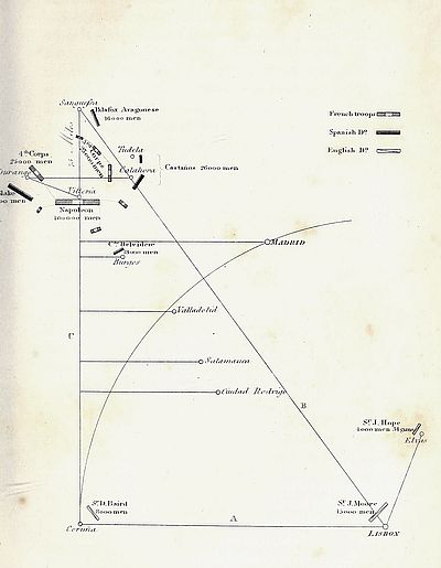 [16] Sir Walter Scott, in his Life of Napoleon, inaccurately asserts, that sir John Moore, “sent ten thousand men, under sir David Baird, by sea, to Coruña,” and that “the general science of war, upon the most extended scale, seems to have been so little understood or practised by the English generals at this time, that instead of the country being carefully reconnoitred by officers of skill, the march of the army was arranged by such hasty and inaccurate information as could be collected from the peasants. By their reports general Moore was induced to divide his army”——What “the general science of war upon an extended scale” may mean, I cannot pretend to say; but that sir David Baird was sent by the government from England direct to Coruña, and that sir John Moore was not induced by the reports of the peasants to divide his army, may be ascertained by a reference to the Appendix, No. 13, section 2.