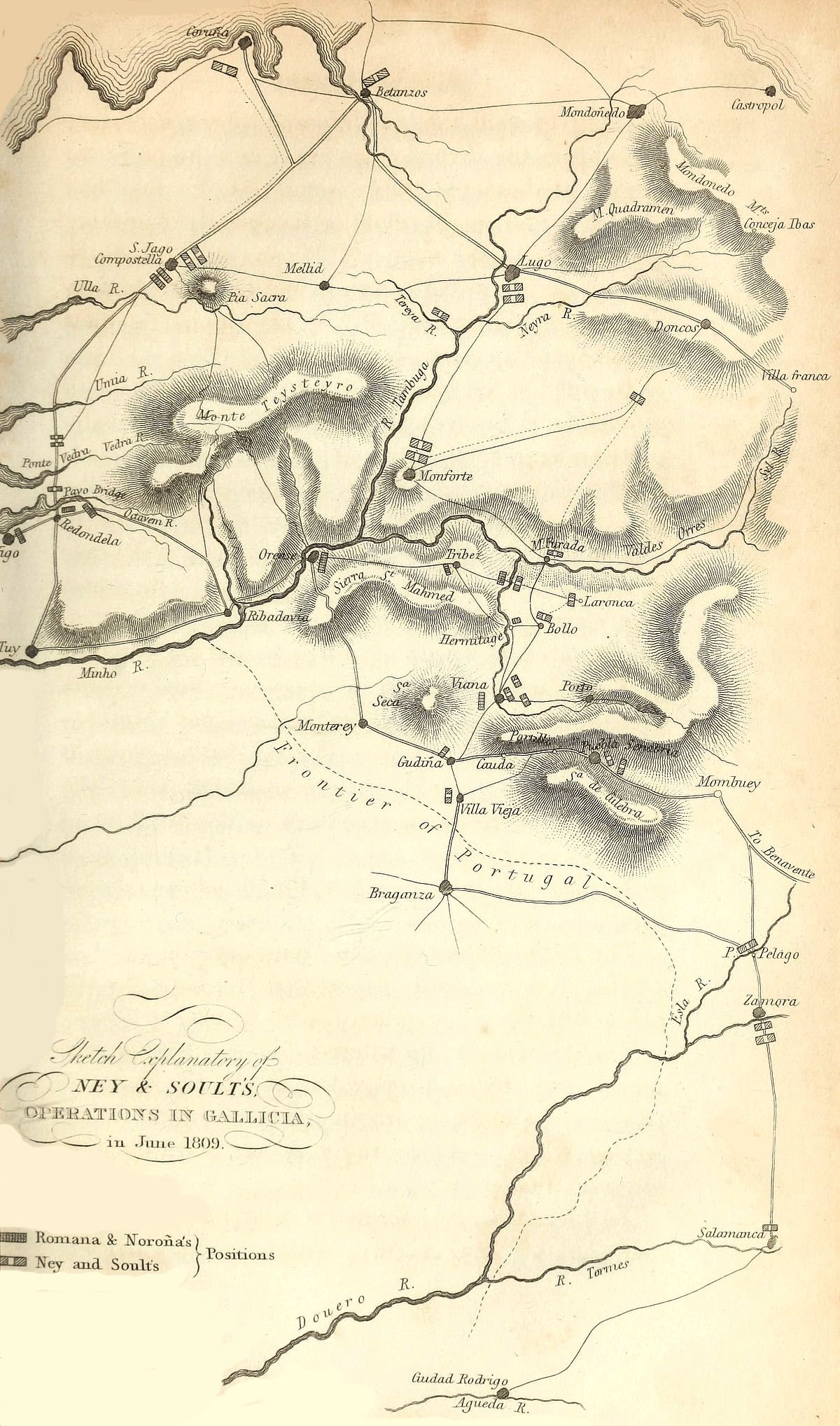 | Coruña and Ferrol surrender to Soult—He is ordered, by the emperor, to invade Portugal—The first corps is directed to aid this operation—Soult goes to St. Jago—Distressed state of the second corps—Operations of Romana and state of Gallicia—Soult commences his march—Arrives on the Minho—Occupies Tuy, Vigo, and Guardia—Drags large boats over land from Guardia to Campo Saucos—Attempt to pass the Minho—Is repulsed by the Portuguese peasantry—Importance of this repulse—Soult changes his plan—Marches on Orense—Defeats the insurgents at Franquera, at Ribidavia, and in the valley of the Avia—Leaves his artillery and stores in Tuy—Defeats the Spanish insurgents in several places, and prepares to invade Portugal—Defenceless state of the northern provinces of that kingdom—Bernadim Friere advances to the Cavado river—Sylveira advances to Chaves—Concerts operations with Romana—Disputes between the Portuguese and Spanish troops—Ignorance of the generals | 162 |
