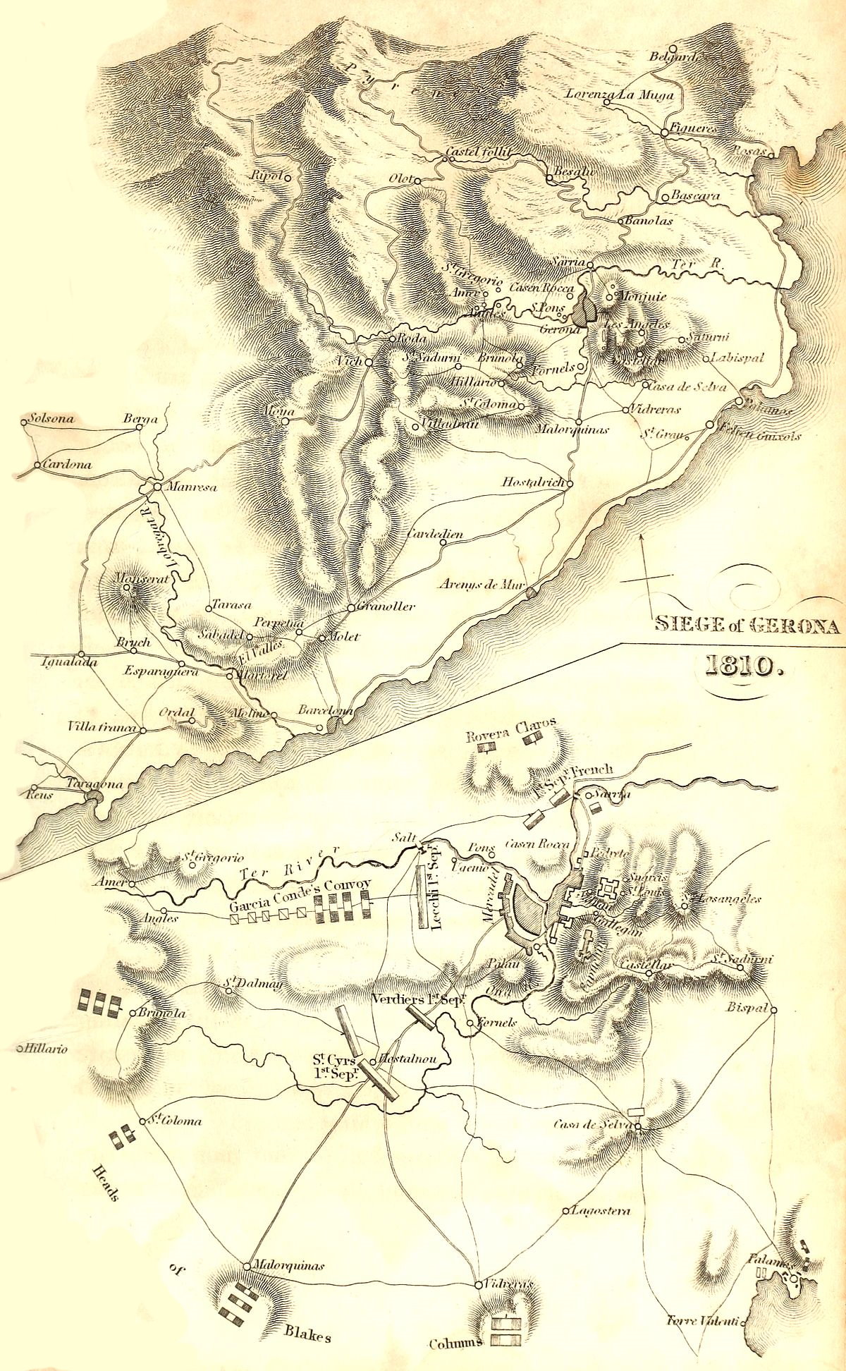 | Claros and Rovira attack Bascara and spread dismay along the French frontier—Two Spanish officers pass the Ter and enter Gerona with succours—Alvarez remonstrates with the junta of Catalonia—Bad conduct of the latter—Blake advances to the aid of the city—Pestilence there affects the French army—St. Cyrâs firmness—Blakeâs timid operations—OâDonnel fights Souham, but without success—St. Cyr takes a position of battle—Garcia Conde forces the French lines and introduces a convoy into Gerona—Blake retires—Siege resumed—Garcia Conde comes out of the city—Ridiculous error of the French—Conde forces the French lines and escapes—Assault on Gerona fails—Blake advances a second time—Sends another convoy under the command of OâDonnel to the city—OâDonnel with the head of the convoy succeeds, the remainder is cut off—Blakeâs incapacity—He retires—St. Cyr goes to Perpignan—Augereau takes the command of the siege—OâDonnel breaks through the French lines—Blake advances a third time—Is beaten by Souham—Pino takes Hostalrich—Admiral Martin intercepts a French squadron— Captain Hallowell destroys a convoy in Rosas-bay—Distress in Gerona—Alvarez is seized with delirium, and the city surrenders—Observations | 31 |