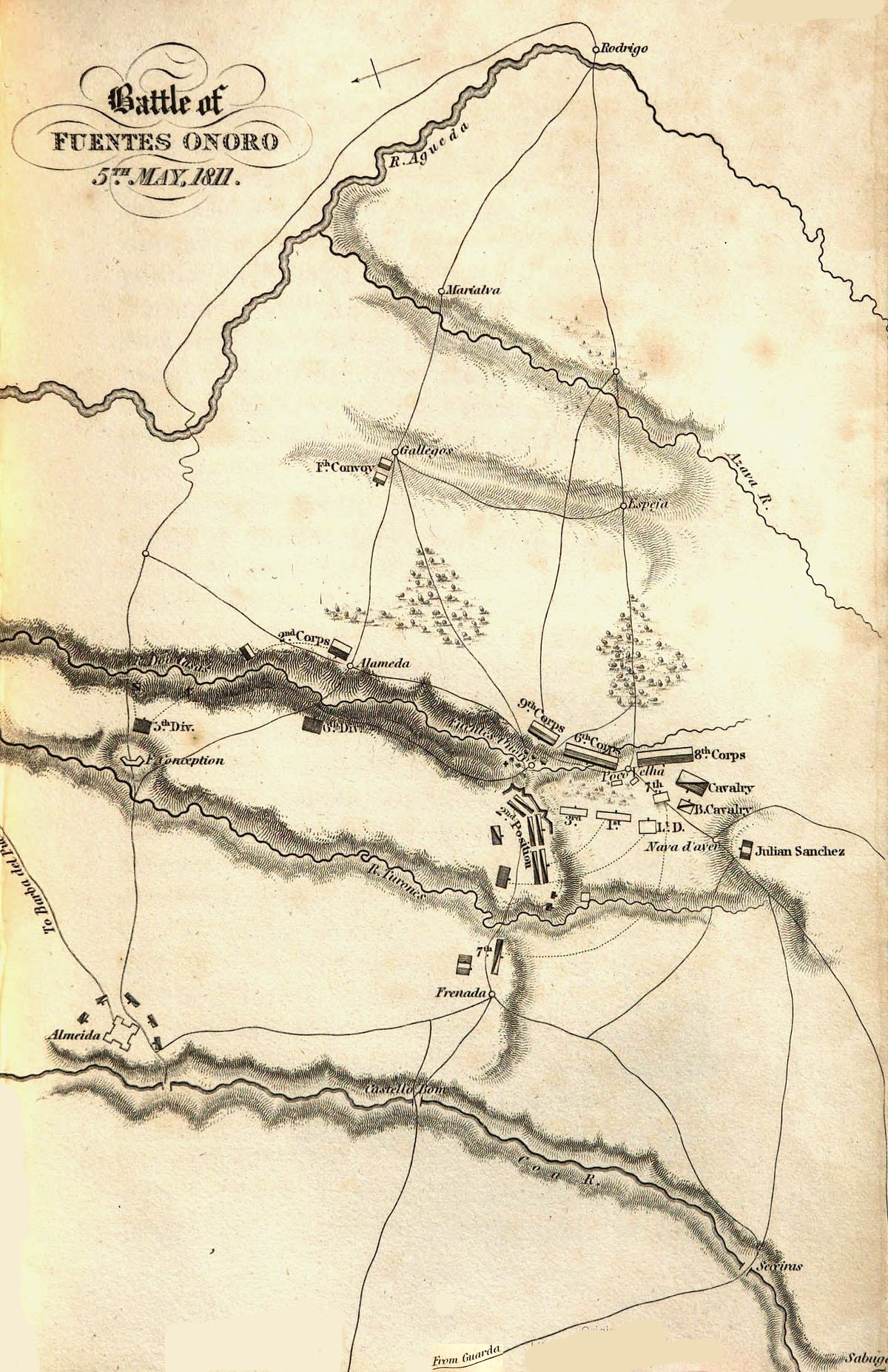 | Estimate of the French loss—Anecdote of Colonel Waters—Lord Wellingtonâs great conceptions explained—How impeded—Affairs in the south of Spain—Formation of the fourth and fifth Spanish armies—Siege of Campo Mayor—Place falls—Excellent conduct of major Tallaia—Beresford surprises Montbrun—Combat of cavalry—Campo Mayor recovered—Beresford takes cantonments round Elvas—His difficulties—Reflections upon his proceedings—He throws a bridge near Jerumenha and passes the Guadiana—Outposts of cavalry cut off by the French—Castaños arrives at Elvas—Arrangements relative to the chief command—Beresford advances against Latour Maubourg, who returns to Llerena—General Cole takes Olivenza—Cavalry skirmish near Usagre—Lord Wellington arrives at Elvas, examines Badajos—Skirmish there—Arranges the operations—Political difficulties—Lord Wellington returns to the Agueda—Operations in the north—Skirmishes on the Agueda—Massena advances to Ciudad Rodrigo—Lord Wellington reaches the army—Retires behind the Dos Casas—Combat of Fuentes Onoro—Battle of Fuentes Onoro—Evacuation of Almeida | 489 |