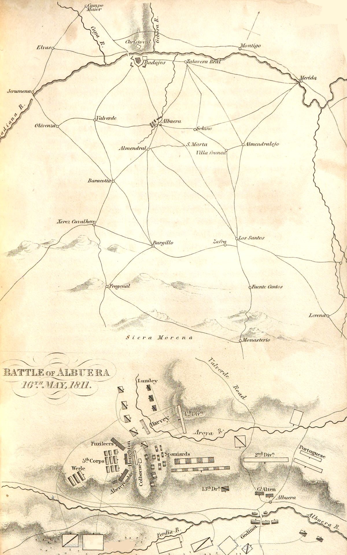 âMay 17, 1811. I reconnoitred the ground in front of Cristoval, and was pressed, by Colonel Fletcher, who was on the other side of the Guadiana, to commence our operations that evening. The soil was hard and rocky, and our tools infamous. I made,[639] however, no difficulties, and we began our battery on the night of the 8th, the moon being at the full: our work was barely four hundred yards from Cristoval. In spite, however, of a most destructive fire of musketry, and shot, and shells, from various parts of the body of the place, we succeeded in completing our battery on the night of the 10th; and, on the morning of the 11th, at four, a. m. its fire was opened. The enemyâs fire was, however, very superior to our own; and, before sunset, the three guns and one howitzer were disabled, for against our little attack was the whole attention of the enemy directed. On the other side of the river the intended attack had not yet been begun, and we sustained the almost undivided fire of Badajos! I told the marshal, when I saw him on the 11th, that to continue to fight our battery was a positive sacrifice; he did not, however, order us to desist until our guns were silenced. If doubt and indecision had not governed all our operations, and had we begun even on the night of the 9th, I am satisfied that our plan of attack was excellent, and that we should have entered the place on the 15th. It is true that two distant batteries were erected, on the left bank of the river, against the place, but they scarcely excited the enemyâs attention; our little corps bore the brunt of the enemyâs exertions, which were great and spirited. Including those who fell in the sortie, our loss has been from six to seven hundred men. Both officers and men were exhausted, mind and body; they felt and saw that they were absurdly sacrificed.â