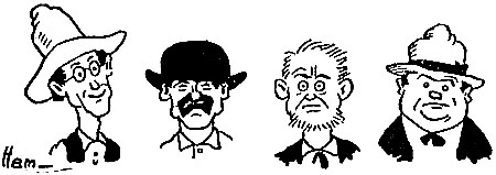 | Listen, dear rooters, and you shall hear Of the ride of a modern Paul Revere. The Paul Revere of “seventy-five” Rode like a fiend and won in a drive. The Paul Revere whose praises I sing Is Arthur Raymond, the spitball king. No plunging charger, no Arab steed, Loans to Raymond its wondrous speed, No dainty thoroughbred, sleek of side, Plays a part in our Raymond’s ride. Just a lumbering wagon, creaking and shaking Serves for the wonderful ride he’s taking. And it hustles him over hollow and hill, Drawn by a good old horse named WILL. [Pg 24] It bumps like blazes and swerves like sin When it nears a bar or passes an inn; It jerks like the tail of a crazy kite When a brewery looms on the left or right. When it nears The Coop or The Rooters’ Rest It bucks as a mustang bucks out West. But, calmly refusing to get a jag on, Raymond clings to that water wagon. * * * To Revere’s great feat you may point with pride, But Raymond is riding a greater ride.[1] |