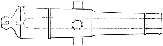 To the indefatigable exertions of Mr. Dean, we are indebted for the recovery of several brass and iron guns, belonging to the “Mary Rose,”—a vessel of war, wrecked in the reign of Henry VIII. of England, and Francis I. of France, in 1545: “while standing along the coast, during a distant firing from the French fleet, under Admiral Annebout, she was overpowered by the weight of her ordnance, and sunk, together with her commander and crew of 600 men.” One of these iron guns is in an excellent state of preservation, considering it to have been immersed above 300 years. The cut on next page will convey, together with the following description, a faint idea[10] of its unwieldy and inefficient construction. It is composed of a tube of iron, whose joint or overlap is as its length; upon this is a succession of iron hoops, composed of iron three inches square, being in fact immense rings; these appear to have been driven on while red hot, and thus, by their contraction, forming a much stronger gun, when combined with the interior tube, than the generality of accounts given of ancient guns would lead us to expect. It will be perceived, that to describe it as “composed of iron bars hooped together,” is not correct. We may also mention, that if parties describing guns of this primitive manufacture will observe accurately, they will find that this is the general method by which they have been fabricated. They all appear to have been loaded by removing a breech part, or chamber, inserting the charge, replacing the chamber, and securing it by wedging it behind; as will be seen on a close inspection. No means of raising or depressing the muzzle appear available;[11] the barrel or gun being sunk in a large block of timber, and secured there by bolts, as a musket barrel is secured in its stock; while a large piece of iron, or wood, was inserted perpendicularly into the deck to prevent the recoil. The advantage of “chambers” was perfectly understood even at this early period; they were apparently slightly conical, with a spherical bottom. It is no mean evidence of ancient skill, and knowledge of gunnery and mechanics combined, to state, that only a few years ago, a gunmaker of some celebrity, constructed a number of rifles and pistols to load at the breech, on the very same principle adopted in this gun 312 years ago. Strange, evidence from “the vasty deep” to show “there is nothing new under the sun.”