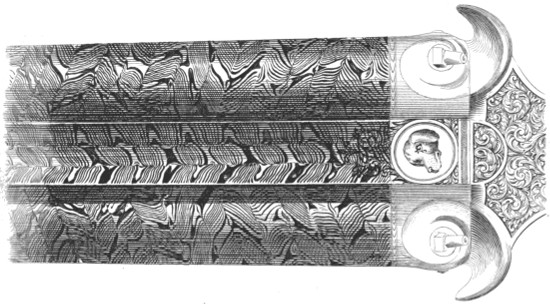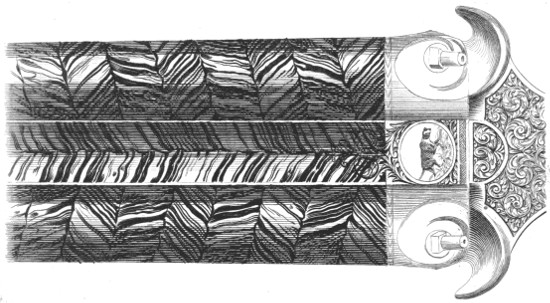The Syrians were formerly celebrated for their skill in the working of iron. Damascus gun-barrels were not to be obtained, at certain periods, at a price less than their weight in silver. The elaborate mixtures in their barrels, swords, and other weapons, entitle them justly to the honour of being the best of iron workers, as we shall hereafter have occasion to show; and the splendour displayed in their inlaying attests their taste and ability: but as mechanicians, formers of complex machinery, they never reached mediocrity. Turkey and Greece, as well as other countries which were renowned as having been, in days of yore, nurseries of the arts, but which have, in later times, degenerated into a condition little better than semi-barbarous, were remarkable for the great labour and pains which they bestowed upon the exterior ornaments of their firearms; but they never succeeded in improving the machinery of the lock in the slightest degree.