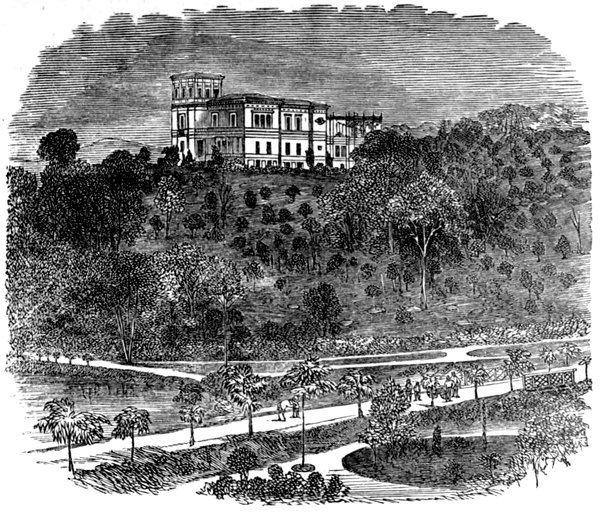 When I lived here in the years 1848 and 1849, there was much sociability,—amongst the English residents at all events—but this appears to have quite died out, and even ceremonial visits are now rarely exchanged. The only society worthy of the name existing in Rio is that associated with the diplomatic circle, which is of course more or less exclusive in its character. I must nevertheless notice one institution in which I found a great change for the better. I mean the English Church. A good deal of money has been spent in connection with this edifice, entirely raised by private subscriptions, and certainly it has been well spent. The recess built out for the communion table is very pretty, and the organ is well placed, in a line with the body of the church. There is a good choir, the whole arrangements being very complete, and the service efficiently performed. The Rev. Mr. Preston is chaplain.