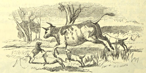 [101] ‘I will mention a few of the uses to which I have seen hides applied. The hammocks in which the people sleep were hides cut, like a puzzle, to spread out as so much net-work, neat, cool, and pleasant. The milk from cows was collected and emptied into a hide spread out on sticks in the shape of a large bucket or tub, capable of holding from sixteen to twenty gallons. The houses and carts were covered with hides; a hide-spout conveyed water off roofs. The tanpits were hides spread out like the milk tub before mentioned, containing other hides under tanning process. Everything connected with horse furniture was supplied by hides. The beams and supports of houses were lashed by hide thongs. The doors and windows, and, frequently, the very walls, were hides laced together; in short, everything almost was hides.’—Mackinnon.