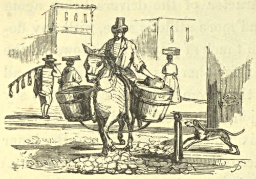 [86] A large proportion of the population of Buenos Ayres, as is stated in the text, consists of foreigners, many of whom have formed matrimonial alliances with the native ladies. The latter are reputed the handsomest women in South America; though the palm is disputed by their fair sisters of Monte Video, on the grounds set forth in the chapter on that head; and, in the unsophisticated state of society in which they move, their frank and obliging manners render them doubly attractive to strangers. They are passionately fond of dancing; and in their love of, if not proficiency in, music will vie with the young ladies of any country in the world. Amongst the men the same taste, in a higher degree, appears to be developed in a talent for poetry; and they are generally well-grounded in most of the leading branches of general, and especially of commercial, knowledge. Living is very moderate here: the river abounds in excellent fish; and fresh meat may be purchased at an exceedingly low rate. Water is comparatively the most expensive article, for the lower orders are obliged to depend for a supply upon the itinerant water-carriers, who hawk it about the streets in ox-carts. But the higher classes generally have large tanks or reservoirs under the pavement of their courtyards, into which the rain-water, collected from the flat-terraced roofs of their houses, is conducted by pipes, and, in general, a sufficiency may thus be secured for the ordinary purposes of the family. In addition to what has been said of the climate of Buenos Ayres, it may be remarked that at times it is insufferably hot; the prevailing character of the atmosphere, however, being dampness, which produces many bronchial affections. But although the whole country appears low and marshy, cases of intermittent fever are hardly known there; and it may therefore be considered generally healthy, but certainly not to the extent to justify the appellation of Buenos Ayres—Good Airs—bestowed upon it by Menoza, its original founder, in special allusion to its supposed salubrity.