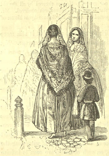 I know that I shall be accused of insensibility and want of taste, when I confess that my first disappointment on landing in Spain was the almost total absence of beauty amongst the Spanish women. Poets have sung of Spain’s ‘dark-glancing daughters,’ and travellers have wandered through the country, with minds so deeply impressed with the preconceived idea of the beauty of the women, that they have found them all their imaginations so fondly pictured, and their works have fostered, what I cannot help maintaining, is a mere delusion; one of the many in which people still indulge when they think and dream of Spain. The women of Spain have magnificent eyes, beautiful hair, and generally fine teeth; but more than that cannot be said by those who are content to give an honest opinion. I have rarely seen one whose features could be called strictly beautiful, and that bewitching grace and fascination about their figures and their walk which they formerly possessed, have disappeared with the high comb which supported the mantilla, and the narrow basquina, which gave a peculiar character to their walk. With the change in their costume, those distinctive charms have vanished. The gaudy colours which now prevail have destroyed the elegance that always accompanies black, in which alone, some years since, a lady could appear in public. No further proof of this is required than to see the same people at church, where black is still considered indispensable, and on the Alameda with red dresses and yellow shawls, or some colours equally gaudy, and combined with as little regard to taste. The men have likewise abandoned the cloak, and now appear in paletots and every variety of foreign invention: nor have they either gained by their sacrifices at the altar of French fashion. By no means distinguished in figure, none needed more the rich folds of the capa to lend them that air of grace and dignity which it peculiarly possesses.
