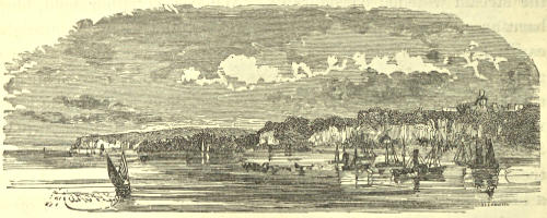 The government charts are exceedingly correct; the land as you approach it is made out without any difficulty, and we saw Pembroke Point and its beacon (now to be superseded by a lighthouse) at the distance of seven miles. The harbour itself is like a large dock, secure from all winds, and with an entrance sufficiently wide for a good smart sailing vessel to beat through with ease. All the dangerous points are distinctly marked by the kelp or sea-weed. The anchorage is excellent, varying from four to five fathoms at low water, so that the Great Britain is everywhere in perfect safety; and even were she to touch the ground, she would not receive any injury, as the bottom is all soft mud.