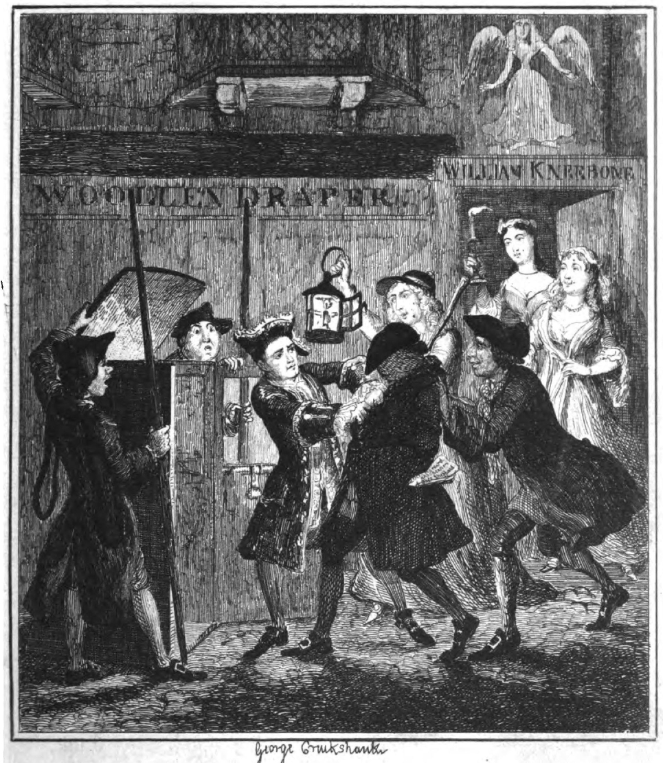 The entrance of Shoe Lane, and the whole line of the wall of St. Andrew's church, the bell of which was tolling, was covered with spectators. Upon the steps leading to the gates of the church stood two persons whom Jack instantly recognised. These were his mistresses, Poll Maggot and Edgeworth Bess. As soon as the latter beheld him, she uttered a loud scream, and fainted. She was caught by some of the bystanders, who offered by her every assistance in their power. As to Mrs. Maggot, whose nerves were more firmly strung, she contented herself with waving her hand affectionately to her lover, and encouraging him by her gestures.