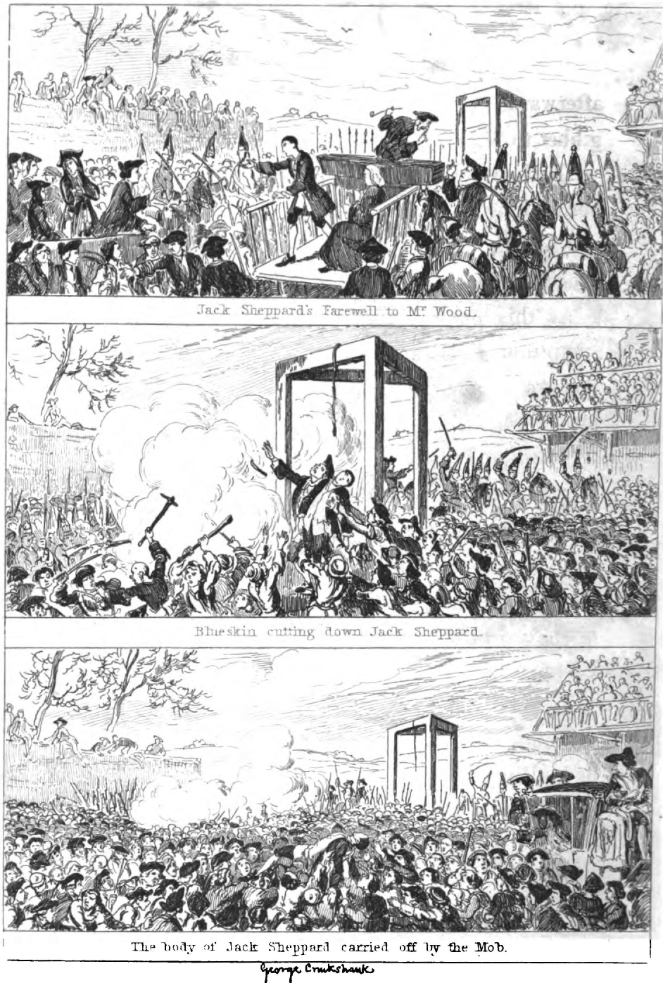 Tyburn was now at hand. Over the sea of heads arose a black and dismal object. It was the gallows. Jack, whose back was towards it, did not see it; but he heard, from the pitying exclamations of the crowd, that it was in view. This circumstance produced no further alteration in his demeanour except that he endeavoured to abstract himself from the surrounding scene, and bend his attention to the prayers which the ordinary was reciting.