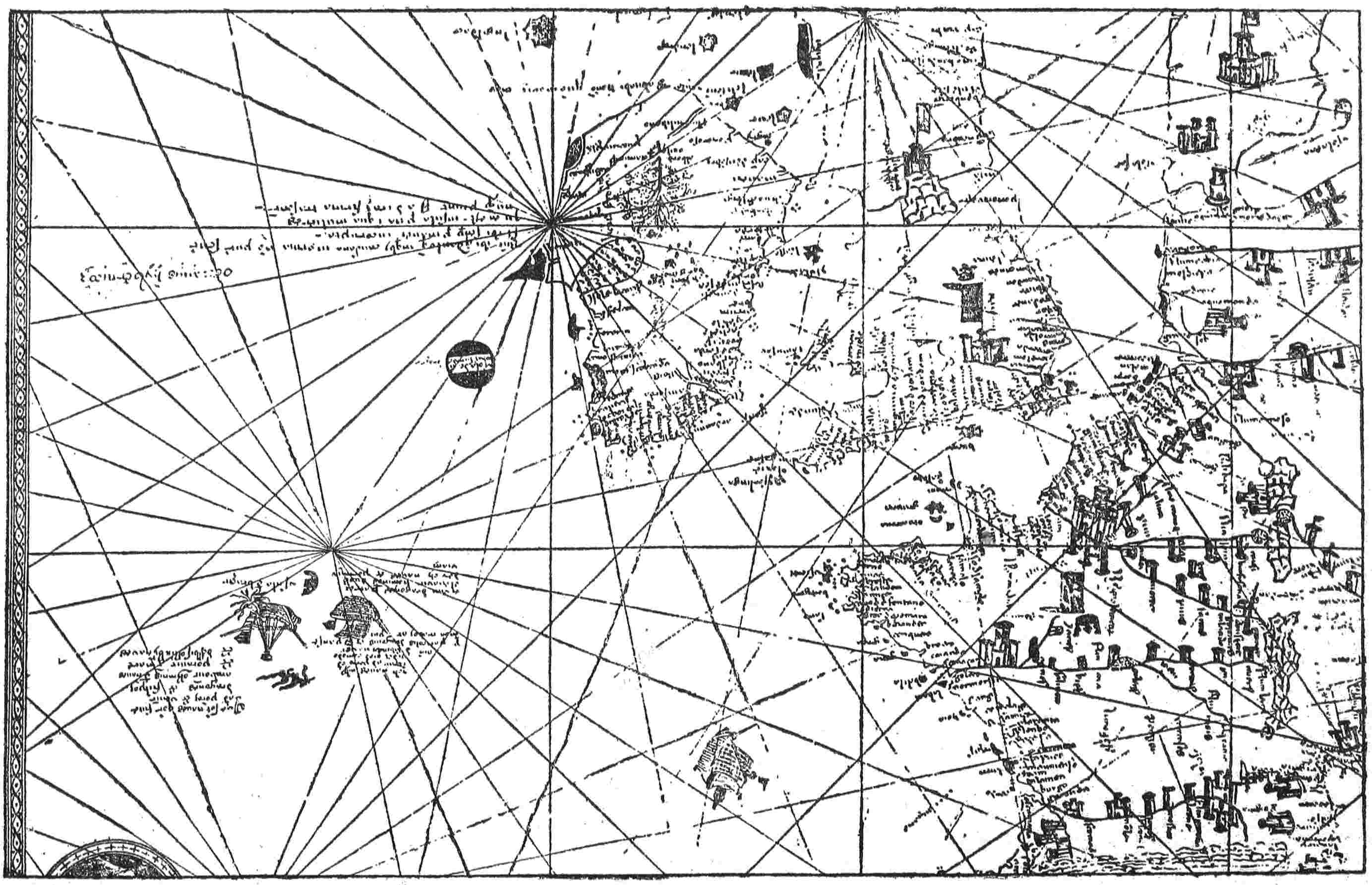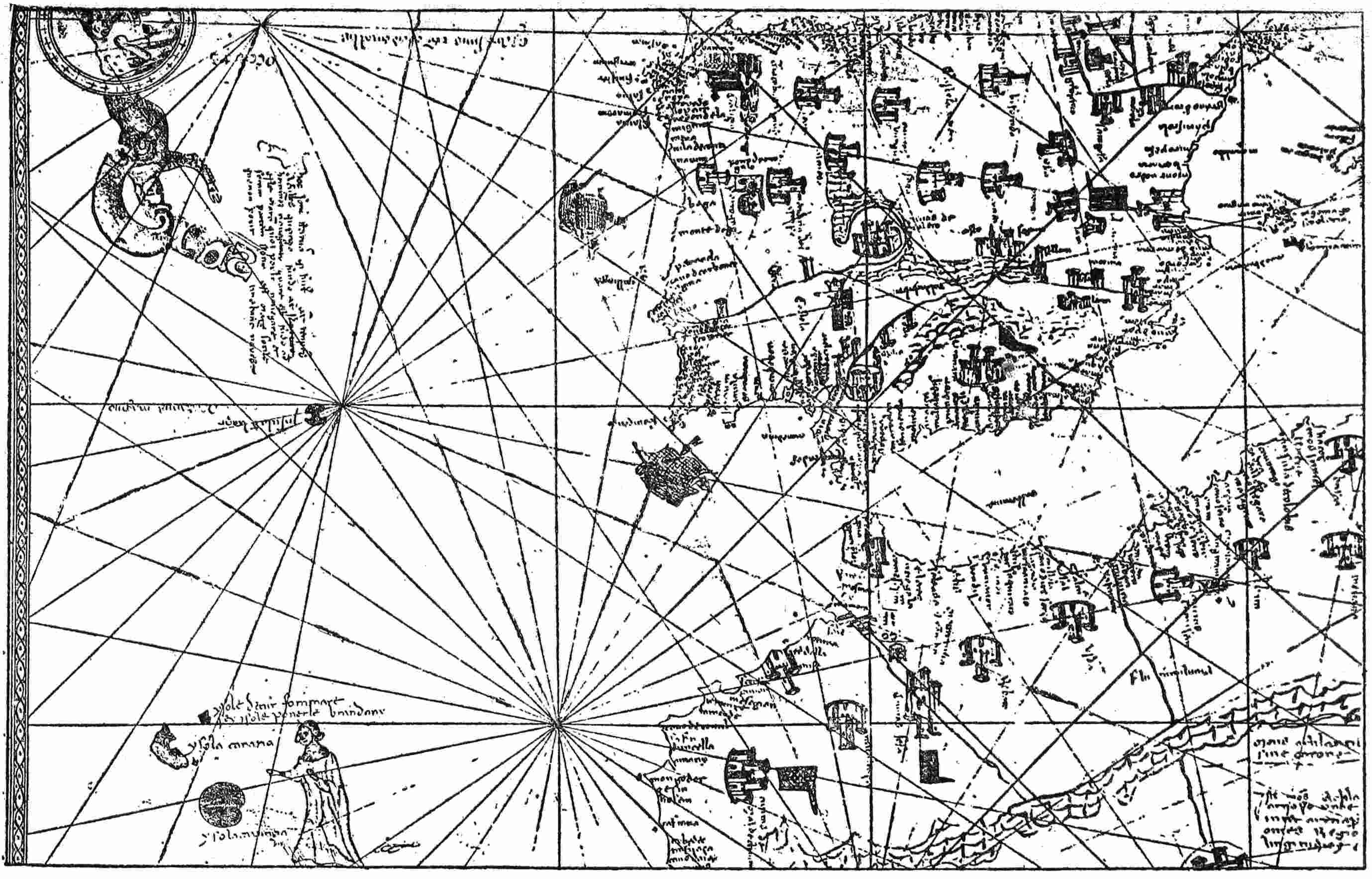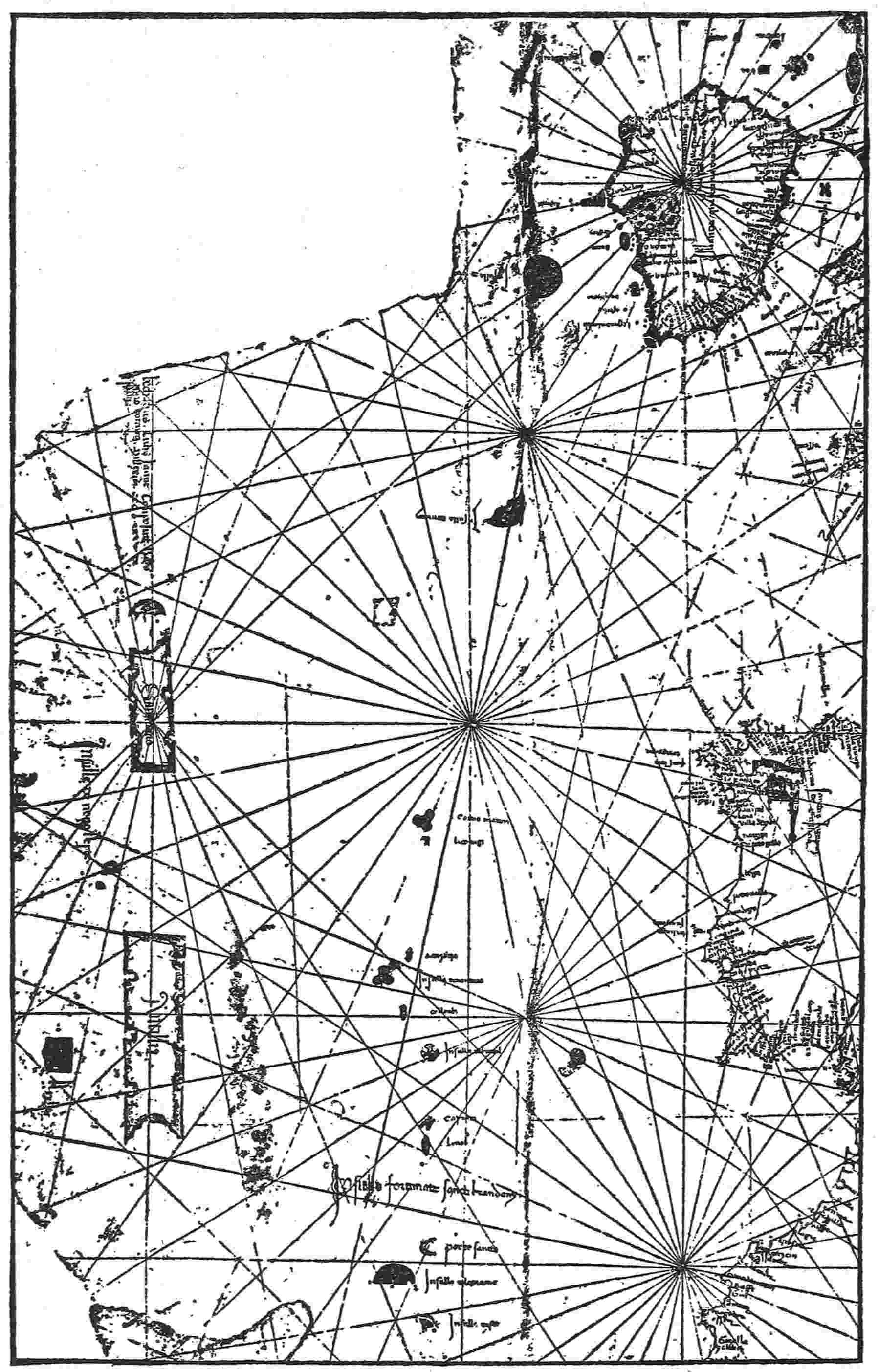 The Italians of the thirteenth century undertook similar explorations and temporarily occupied at least one of the Canary Islands, Lanzarote, which still bears, corrupted, the name of its Genoese invader, Lancelota Maloessel, of about 1470. On early fourteenth-century maps and some later ones the cross of Genoa is conspicuously marked on this island in commemoration of the exploit. It was probably at this period that Italian names were applied to most of the Azores and to other islands of the eastern groups. A few of these names still persist, for example, Porto Santo and Corvo; but others, after the rediscovery, gave way to Portuguese equivalents or substitutes. Thus Legname was translated into Madeira, and Li Conigi (Rabbit Island) became more prettily Flores (Island of Flowers). About 1285 the Genoese also sent out an expedition9 “to seek the east by way of the west” under the brothers Vivaldi, who promptly vanished with all their men. Long afterward another expedition picked up on the African coast one who claimed to be a survivor; and it is probable that the Genoese expedition attempted to sail around Africa but came upon disaster before it was far on its way. The thirteenth- and fourteenth-century Italians undoubtedly added many islands to the maps or secured their places there; but we have no evidence that they passed westward beyond the middle of the Atlantic.