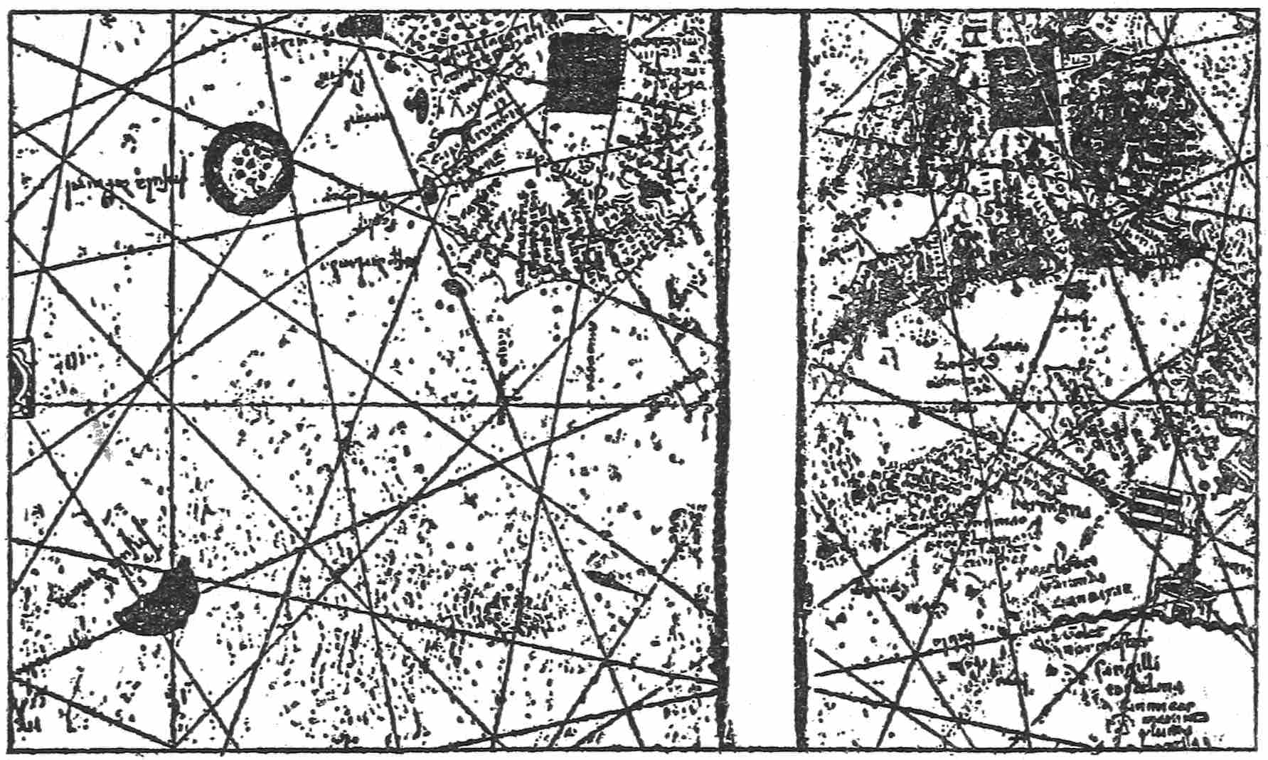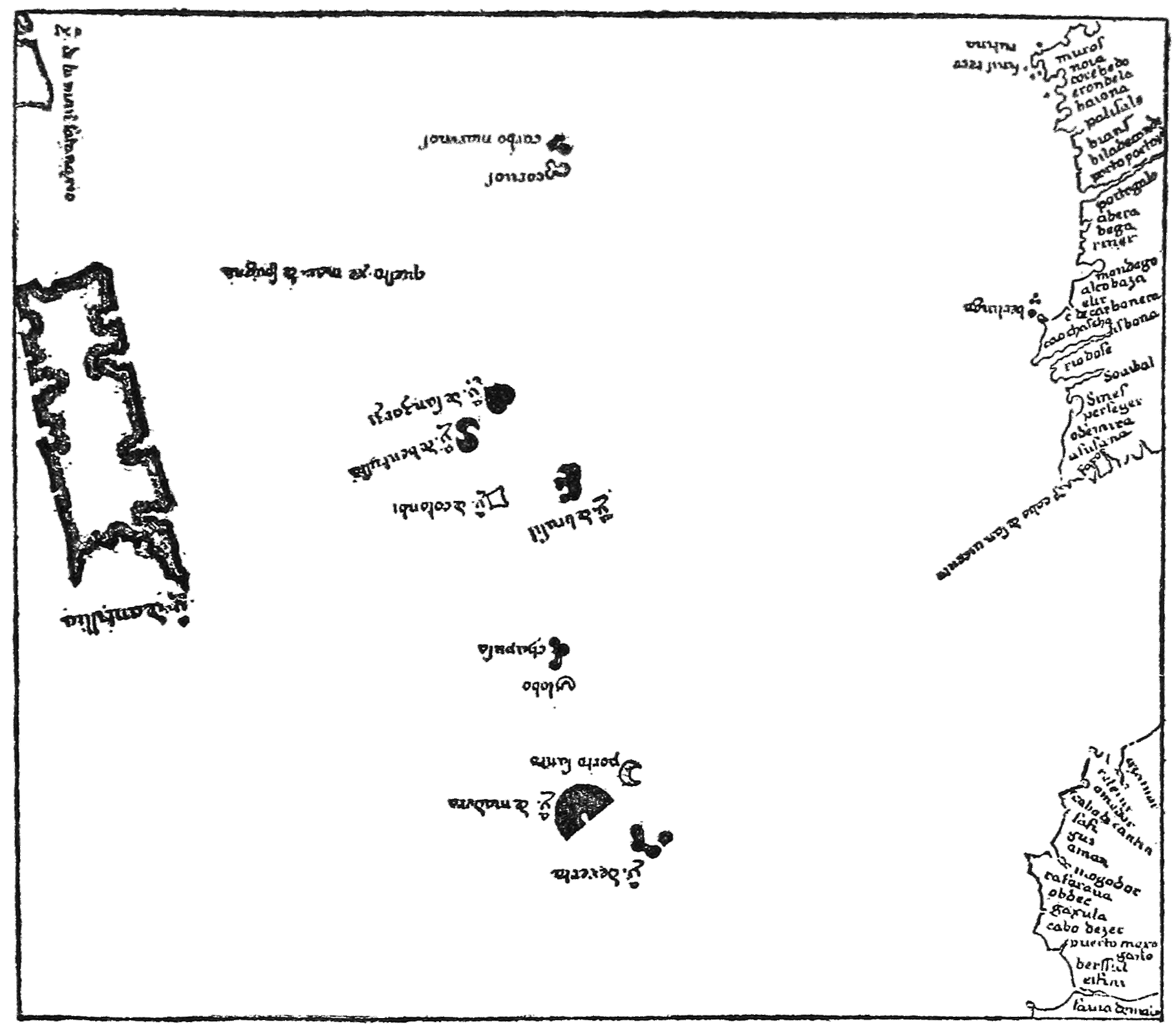 The Moors who conquered Spain took up the task of Atlantic exploration from that coast after a time. Its islands appear in divers of the Arabic maps. In particular we know through Edrisi,8 the most celebrated name of Arabic geography, of the extraordinary voyage of the Moorish Magrurin of Lisbon, who set out at some undefined time before the middle of the twelfth century to cross the Sea of Darkness and Mystery. They touched upon the Isle of Sheep and other islands which were or were to become notable in sea mythology. Perhaps these islands were real, but they are not capable of certain identification now. These Moorish adventurers seem to have reached the Sargasso Sea and to have changed their course in order to avoid its impediments, attaining finally what may have been one of the Canary Islands, where they suffered a short imprisonment and whence, after release, they followed the coast of Africa homeward. Edrisi about 1154 wrought a world map in silver (long lost) for King Robert of Sicily and also wrote a famous geography illustrated by a world map and separate sectional or climatic maps. He devotes some space to Atlantic islands and their legends, shows a few of them, and believes in twenty-seven thousand; but the very few copies of his work which remain were made at different periods and in different nations, and their maps disagree surprisingly; so that it is not practicable to restore with certainty what he originally depicted. He seems to have had at least some acquaintance with the authentic island groups from the Cape Verde Islands to the Azores and Britain. The fantastic legends he appends to some of them do not seem to have greatly affected the prevailing European lore of that kind.