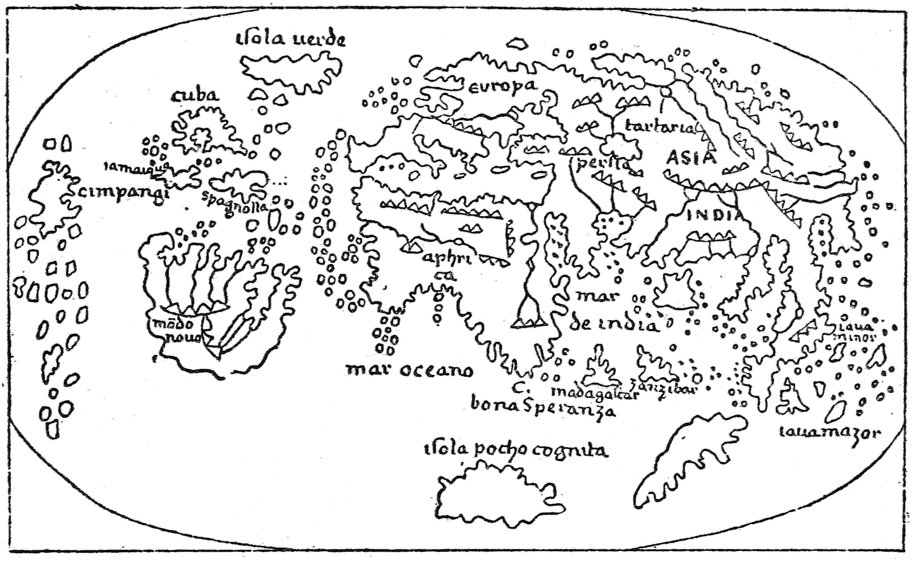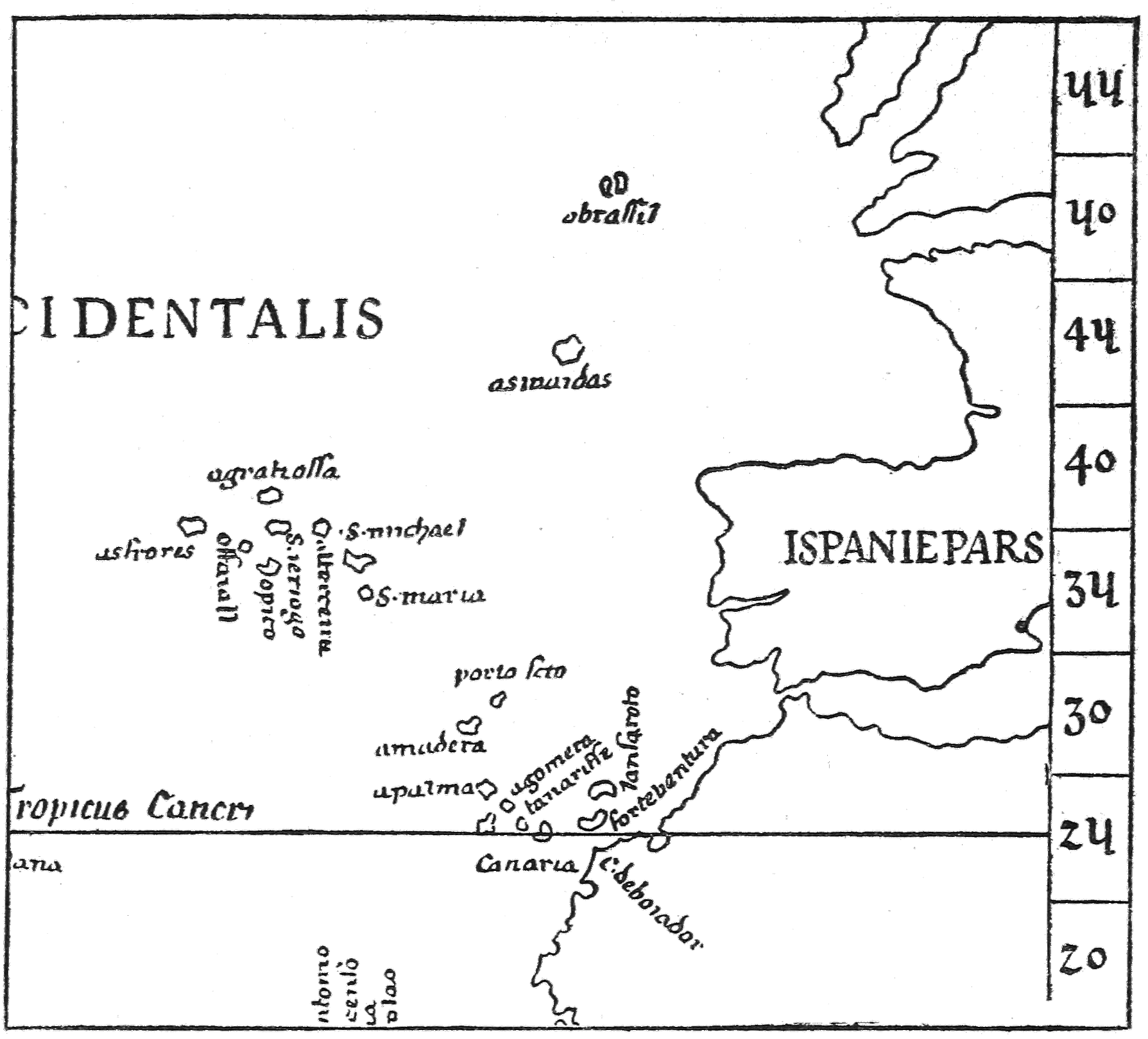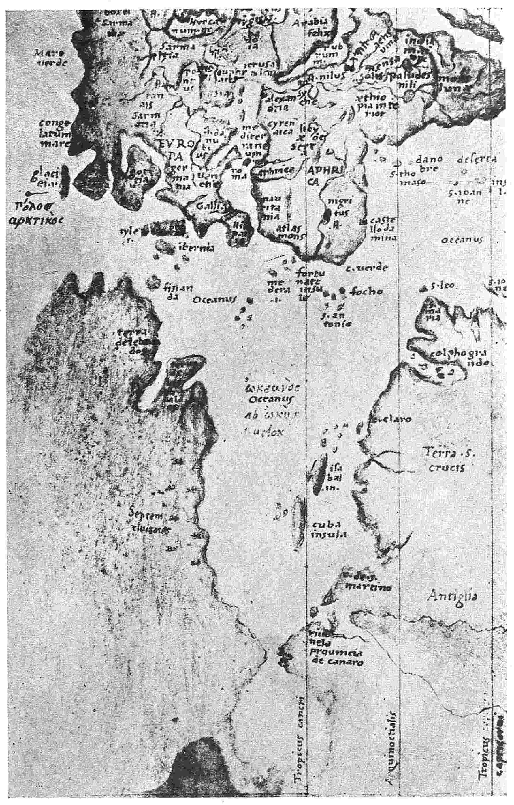 This brings us down to the rise of Portuguese nautical endeavor, which seems to have begun earlier than has generally been supposed but became most conspicuous under the direction of Prince Henry the Navigator. Its achievements included the rediscovery of Madeira and the Azores, which in many quarters had been forgotten, the exploration of the African coast, the accidental discovery or rediscovery of South American Brazil by Cabral, and the voyage of Vasco da Gama to India around the Cape of Good Hope. Perhaps we might insert in the list the discovery of Antillia. At any rate, it got on the map with a10 Portuguese name in the first half of the fifteenth century, and several other islands accompanied it. They all certainly seem to be American and West Indian.