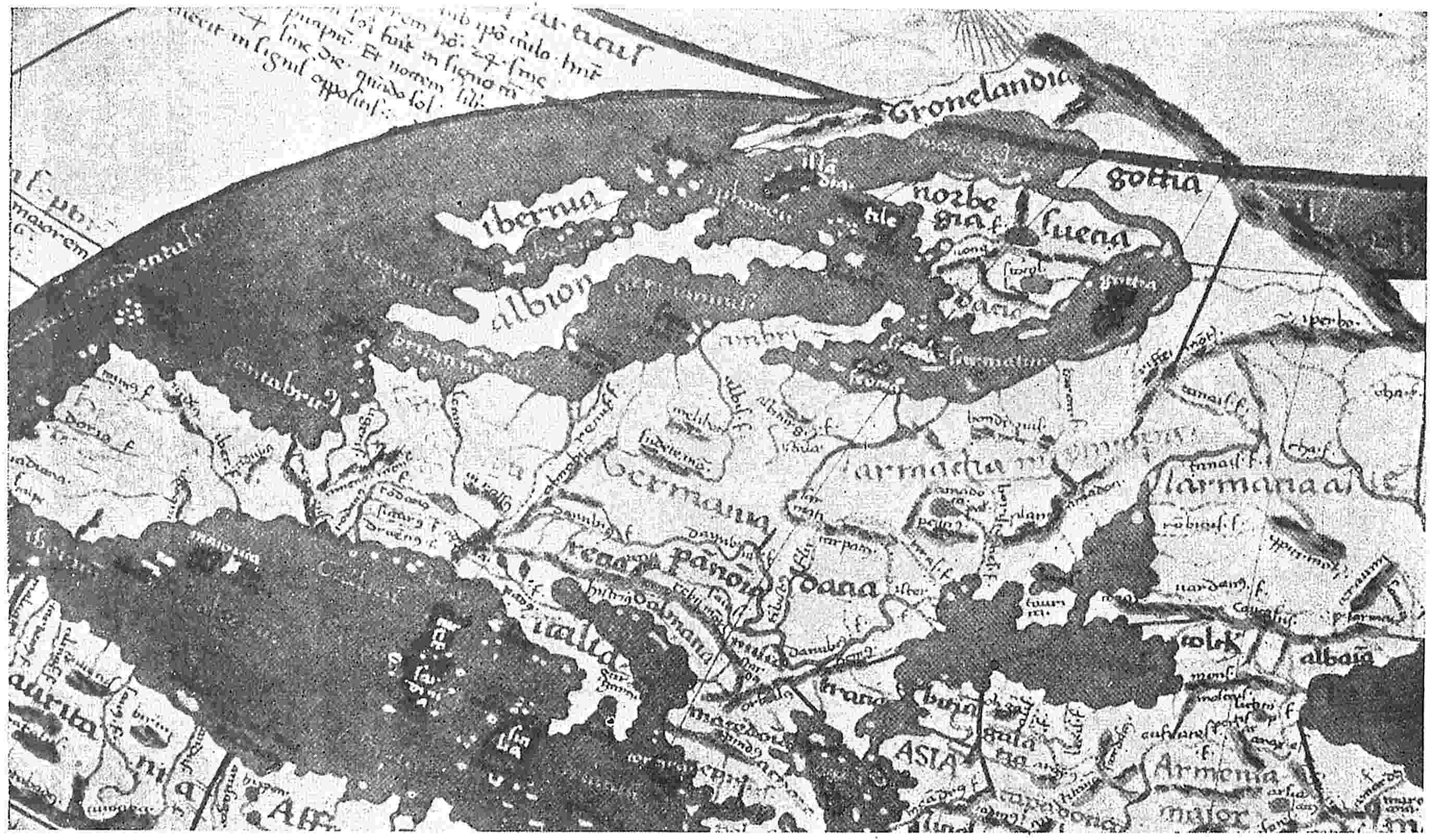 A little later Scandinavians followed along the northern route, finding convenient stopping points in the Faroes and Iceland, discovered Greenland, and planted two settlements on its southwestern shore in the last quarter of the tenth century (Ch. VII). Some of their ruins, a less number of inscriptions, and many fragmentary relics and residua are found, so that we can form a good idea of their manner of life. Such as it was, it endured more than four hundred years. To contemporary and slightly later geography Greenland appeared most often as a far-flung promontory of Europe, jutting down on the western side of the great water;6 but sometimes it was thought of as an oceanic island, with greater or less shifting of location, and seems to be responsible for divers mythical Green Islands of various maps and languages.