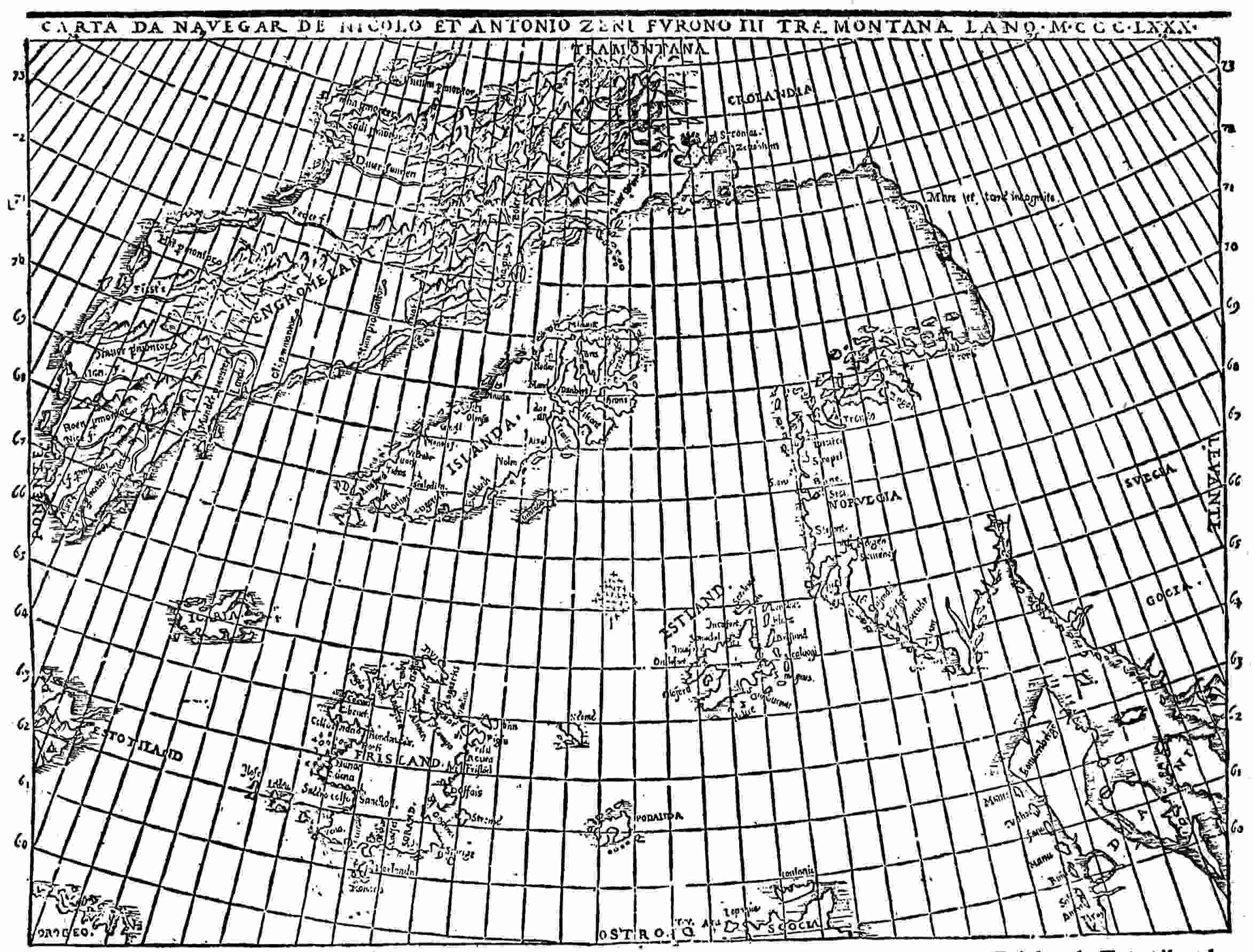It has been alleged that two Venetian brothers, Antonio and Nicolò Zeno, in the service of an earl of the northern islands, took part with him about 1400 A. D. in certain explorations westward, he being incited thereto by the report of a fisherman, who claimed to have spent many years as a castaway and captive in regions southwest of Greenland. The Zeno narrative, dealt with later (Ch. IX), was accompanied by a map (Fig. 19), which exercised a great influence during a long period on all maps that succeeded it, adding several islands never before heard of. Both map and narrative are recognized as spurious or at best so corrupted by misunderstandings and transformed by rough treatment and a post-Columbian attempt at reconstruction as to be wholly unreliable. It is, indeed, possible that a fisherman of the Faroes made an involuntary sojourn in Newfoundland and elsewhere in America from about 1375 or 1380 onward and that his story induced the ruler of certain northern islands to sail westward and investigate. But both features are very dubious, and at any rate nothing was accomplished except the confusion of geography.