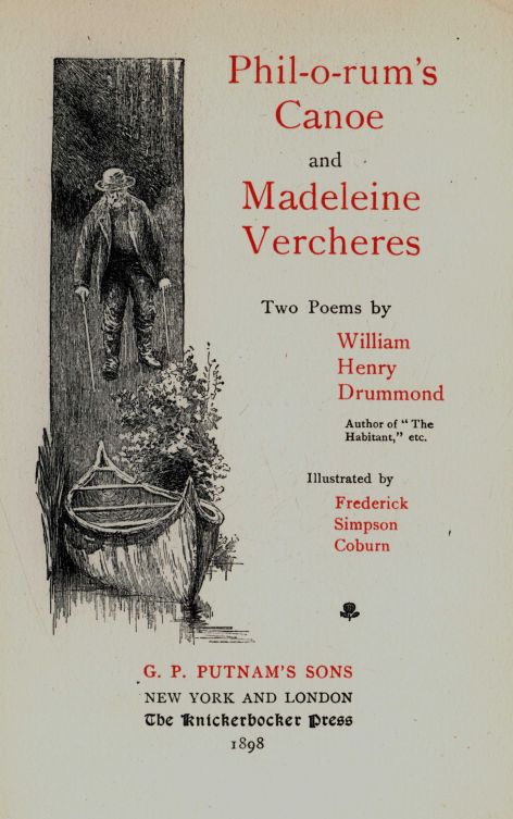 "O ma ole canoe, wat 's matter wit' you,an' w'y was you be so slow?Don't I work hard enough on de paddle, an'still you don't seem to go--No win' at all on de fronte side, an' currentshe don't be strong,Den w'y are you lak' lazy feller, too sleepy formove along?"I 'member de tam, w'en you jomp de sam'as deer wit' de wolf behin',An' brochet on de top de water, you scareheem mos' off hees min':But fish don't care for you now at all, only jus'mebbe wink de eye,For he know it 's easy git out de way, w'enyou was a-passin' by"----I 'm spikin' dis way, jus' de oder day, w'en I 'mout wit' de ole canoeCrossin' de point w'ere I see, las' fall, wan verybeeg caribou,Wen somebody say, "Phil-o-rum, mon vieux,wat 's matter wit' you youse'f?"An' who do you s'pose was talkin'? W'y depoor ole canoe shese'f.O yass, I 'm scare w'en I 'm sittin' dere, an'she 's callin' ma nam' dat way."Phil-o-rum Juneau, w'y you spik so moche,you 're off on de head to-day:Can't be you forget, ole feller, you an' mewe're not too young,An' if I 'm lookin' so ole lak' you, I t'ink Iwill close ma tongue."You should feel ashame, for you 're alwayblame, w'en it is n't ma fault at all,For I 'm tryin' to do bes' I can for you onsummer-tam, spring, an' fall.How offen you drown on de reever, if I 'mnot lookin' out for youW'en you 're takin' too moche on de w'isky,some night comin' down de Soo."De firse tam we go on de Wessoneau, nofeller can beat us denFor you 're purty strong man wit' de paddle,but dat 's long ago, ma frien',An' win' she can blow off de mountain, an'tonder an' rain may come,But camp see us bote on de evening--youknow dat was true, Phil-o-rum."An' who 's your horse, too, but your olecanoe, an' w'en you feel cole an' wet,Who was your house w'en I 'm upside down,an' onder de roof you get,Wit' rain ronnin' down ma back, Baptême! tillI 'm gettin' de rheumateez,An' I never say not'ing at all moi-meme, butlet you do jus' you please?"You t'ink it was right, kip me out all nighton reever side down below,An' even 'bon soir' you was never say, butoff on de camp you go,Leffin' your poor ole canoe behin', lyin' dereon de groun',Watchin' de moon on de water, an' de batflyin' all aroun'?"Oh, dat's lonesome t'ing hear de grey owlsing up on de beeg pine tree!An' many long night she kip me awake till sunon de Eas' I see,An' den you come down on de morning forstart on some more voyage,An' only t'ing decen' you do all day, is carryme on portage."Dat 's way, Phil-o-rum, rheumateez shecome, wit' pain ronnin' troo' ma side,Wan leetle hole here, 'noder beeg wan dere,dat not'ing can never hide,Don't do any good feex me up agen, no matterhow moche you try,For w'en we come ole an' our work she 'sdone, bote man an' canoe mus' die."Wall, she talk dat way mebbe mos' de day tillwe 're passin' some beaver dam,An' wan de young beaver, he 's mak' hees tailcome down on de water Flam!I never see de canoe so scare, she jomp nearlytwo, t'ree feet,I t'ink she was goin' for ronne away, an' sheshut up de mout' toute suite.It mak' me feel queer, de strange t'ing I hear,an' I 'm glad she don't spik no more,But soon as we fin' ourse'f arrive over dere onde 'noder shoreI tak' dat canoe lak' de lady, an' carry her offwit' me,For I 'm sorry de way I 'm treat her, an' sheknow more dan me, sapree!Yass, dat 's smart canoe, an' I know it 's true,w'at she 's spikin' wit' me dat day,I 'm not de young feller I use to be, w'en workshe was only play,An' I know I was comin' closer on place w'ereI mus' tak' care,W'ere de mos' worse current 's de las' wan too,de current of Dead Riviere.You can only steer, an' if rock be near, wit'wave dashin' all aroun',Better mak' leetle prayer, for on Dead Riviere,some very smart man get drown;But if you be locky an' watch youse'f, mebbereever won't seem so wide,An' firse t'ing you know you 'll ronne ashore,safe on de 'noder side.