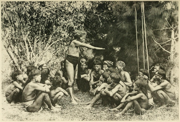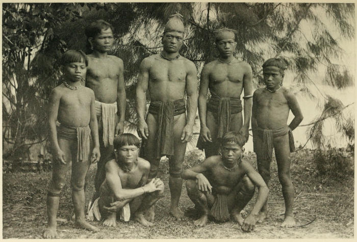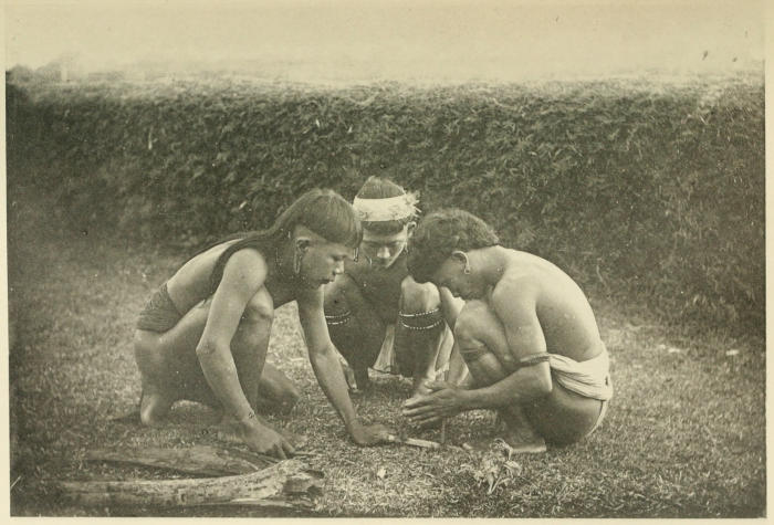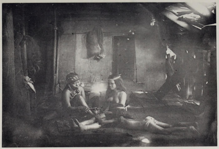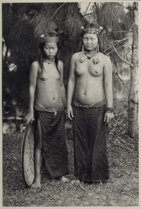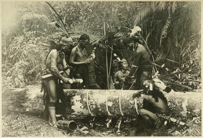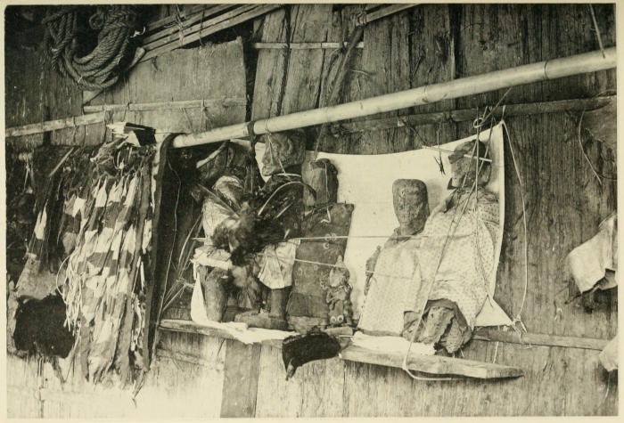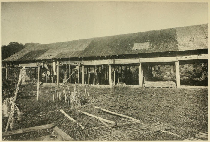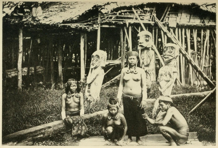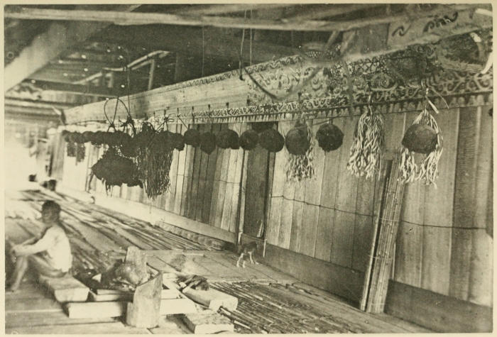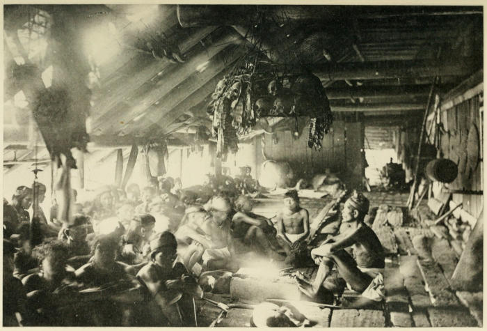 While to scenery, it is distance,—and photography,—which lends enchantment, it is, on the contrary, propinquity which, in my experience, lends to the Borneo Head-Hunters and to their Home-life, a charm which cannot be wholly dispelled even by the skulls hanging from the rafters of their houses. After living among them, for months at a time, an insight is gained into their individualities and peculiarities which a casual sojourn can never disclose. Some, of course, are ill-tempered, crotchety, selfish; others, again, are mild, gentle, generous. The youths have their languishing loves, which they are eager to confide to sympathetic ears. The maidens are coy, or demure, or bashful, when their lovers are near, and delight in teasing and tormenting. The Bornean mothers and fathers think their babies the prettiest that ever were born; and the young boys are as boyish as school-boys here at home, and are quite as up to all mischief.