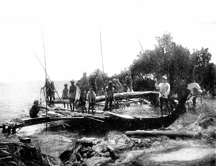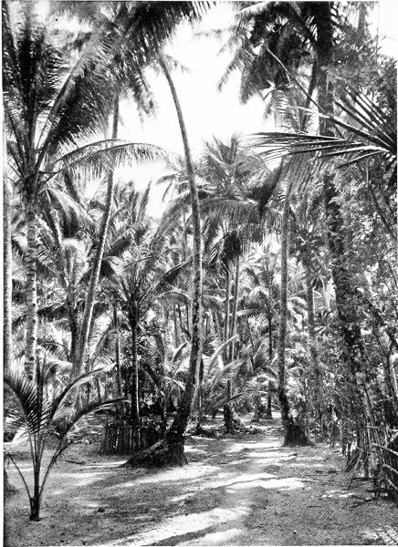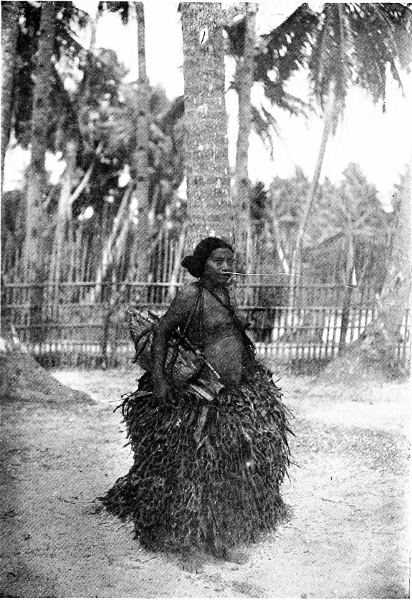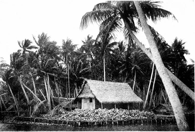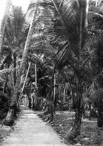 As soon as the Oceana had discharged her cargo and departed on her way to Hong-Kong, we set our sail of matting in Friedlander’s[20] native-built copra barge, which was fairly loaded to the gunwales with my luggage and photographic outfit, and glided through green aisles of mangrove and over the glassy blue and green water of the lagoon to the southern end of the island where lies the delightful, scattered little village of Dulukan.