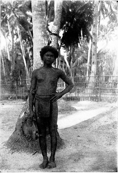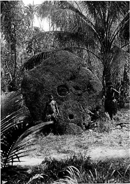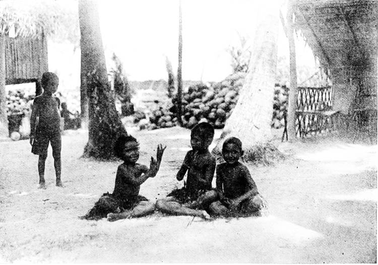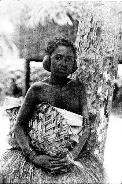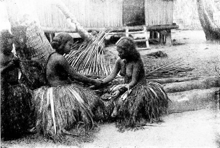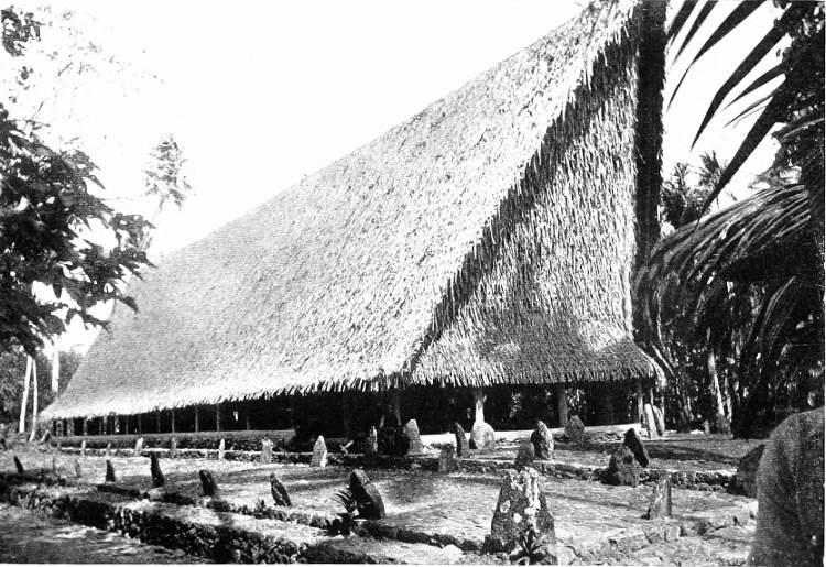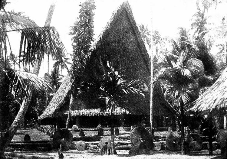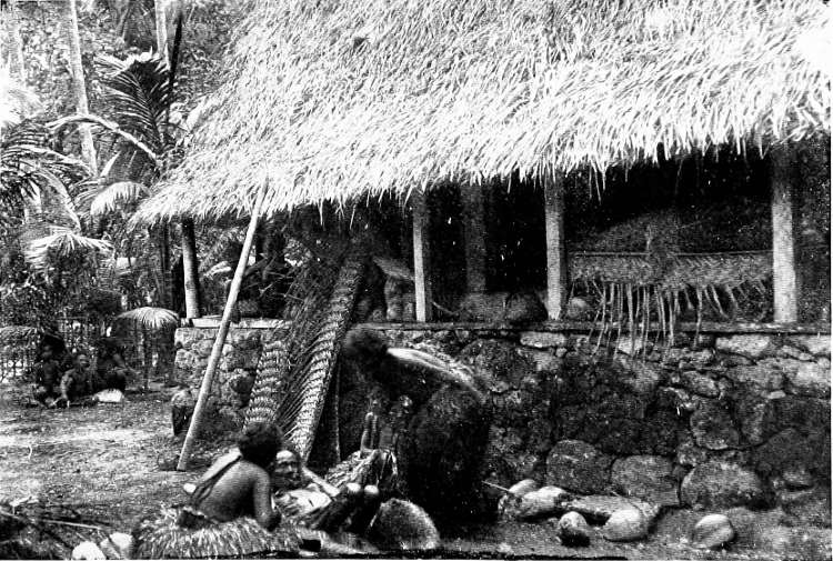 In the little yards or clearings about the houses and on the larger broad platform of stones whereon the houses are built, all that there is of village life goes on; here guests are received and entertained, councils of the wise held, and news passed round. It is decidedly bad manners for any visitor to enter a house, except by special invitation, no matter how intimate a friend he may be. Very often, to[24] add to comfort, upright stones are imbedded in the lower platform to serve as back rests when sessions of the councils happen to be prolonged or the orator prosy. A matting of bamboo grass, or else panels of interwoven fronds of the coconut palm form the side walls of the house; security and secrecy, it must be remembered, are hardly necessary in such small communities, where all are acquaintances, and every article of household use or of luxury is almost as well known to everybody as to the actual owner; stolen goods are not marketable and thefts are quite rare, except, of course, of coconuts that happen to fall unexpectedly and temptingly from a neighbour’s tree.