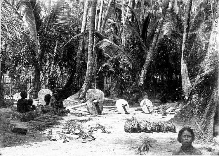 I was most hospitably entertained by Herr Friedlander, one of these copra traders, and, in point of residence, the oldest white trader on the island. With a courteous friendliness for which I shall be always grateful, he invited me to lodge with him at his little copra station in Dulukan, where I could be all the time in close touch with the natives; not only was he always ready to act as my interpreter, but was also at every turn unwearied in his kindness and devotion. I had expected and hoped to share the home life in the houses of the natives, as I had done in Borneo, but the village life and the home life of the people of Uap differ so widely from those of the Borneans that I found it would be better by far to stay in Herr Friedlander’s comfortable little pile-built house and visit the natives, or get them to visit me.