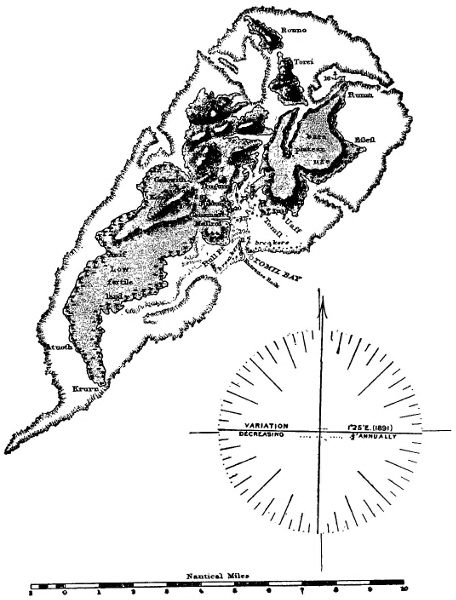 The island is divided into districts, more or less defined, which are the remnants of former days when these districts marked the division into hostile tribes; but now, under one government, these separate districts are but little regarded as tribal divisions, and within them the houses are scattered indiscriminately in small groups. Such a thing as a village street or even a road between rows of dwellings nowhere exists; there is, therefore, nothing of what we would call village life, when