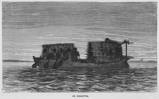 We had to cross a river said to be infested by crocodiles. The natives walked close to us on either side, beating the water with long sticks to keep them away. The natives look on them with great dread, and attempt to propitiate them by charms or sacrifices, instead of endeavouring to destroy them. They, however, take their eggs in great numbers, and dry them for food.