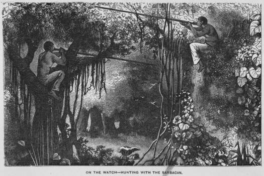 After this our journey was enlivened by all sorts of horrible accounts of adventures with caymans, till we neared the spot where we expected to find some buffaloes. As we rode along we heard an extraordinary cry. “It is a wild boar,” exclaimed our friend; “but I suspect a boa has got hold of him—a great bore for him, I suspect.” We rode to the spot whence the sound came. There, sure enough, suspended from the low branch of a tree was a huge boa-constrictor, some twenty feet