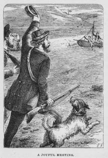 As he spoke, three guns were fired in quick succession from the Triton. The noise and smoke, to which the savages were evidently unaccustomed, made them desist paddling. We redoubled our efforts, and shot ahead. After a little hesitation, the savages once more pressed on after us, but happily at that moment the ship again fired. Mr Brand at the same time seized the muskets and discharged them one after the other over the heads of our pursuers. Again they wavered, some even turned their canoes about, two or three only advanced slowly, the rest ceased paddling altogether. This gave us a great advantage, and without waiting to let Mr Brand reload the muskets, we paddled away with our hopes of escape much increased. Some minutes elapsed, when the courage of the savages returned, and fearing that we might altogether escape them, they all united in the pursuit. The breeze, however, freshened, the ship rapidly clove the waters, and before the canoes had regained the distance they had lost, we were alongside. Loud shouts of welcome broke from every quarter of the Triton as we clambered up her side.