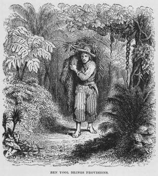 a hill. It might be a savage, though. I kept my rifle ready, in case it should prove an enemy. To my great satisfaction it proved to be Ben. He came loaded with bread-fruits and cocoa-nuts, and what was undoubtedly the hind quarters of a pig, while a calabash full of water hung round his neck. “I was afraid that I should have to come back without anything for my trouble,” said he. “Just then, under a tree, I stumbled over these provisions. How they came there I don’t know, but there they are and let us be thankful.”