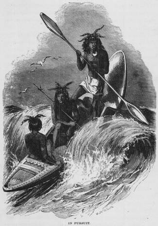 the bottom. The other canoes contained more savages, and followed close after their leader. This made us redouble our efforts to escape. We darted through the passage just as a dozen canoes or more left the shore. We had a terribly short start of them, and they paddled nearly twice as fast as we could.