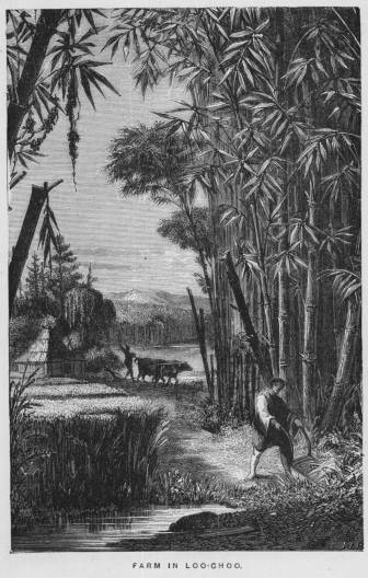 We passed over several well-made bridges, and along a paved causeway, having on either side a succession of beautiful gardens and fertile rice-fields, while before us rose a hill covered with trees, out of which peeped a number of very pretty-looking villas. When we reached the top of the hill we had a fine view over a large portion of the island—several towns and numerous villages were seen, with country-houses and farms scattered about. Altogether, we formed a very favourable opinion of the island and the advanced state of civilisation among the people of Loo-Choo.