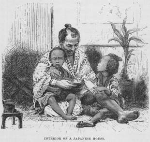 travelling stops at a lodging-house, his banner is conspicuously displayed outside, while the names of inferior guests are fastened to the door-posts. The doctor made a capital sketch of a scene we saw when looking into the interior of a Japanese house—a servant apparently feeding two children.