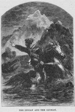 The lake and rivers running into it abound with these savage monsters, a species of alligator or crocodile. The man forced his horse into the stream and swam on some way. Suddenly we were startled with the cry of “A cayman! a cayman! Take care, man!” The Indian threw himself from his horse and swam boldly to the bank, leaving his poor steed to become the prey of the monster. The cayman made directly for the horse, and seized him with his huge jaws by the body. The poor steed’s shriek of agony sounded in our ears, but fortunately for him the saddle-girth gave way, and he struggled free, leaving the tough leather alone in the brute’s mouth, and swam off to shore. The cayman, not liking the morsel, looked about for something more to his taste.