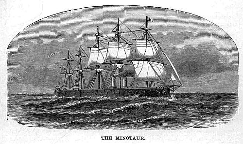 Late in the evening we crossed the harbour to the dockyard, where papa wanted to pay a visit. A curious steam ferry-boat runs backwards and forwards between Portsmouth and Gosport. We passed a number of large ships coated with thick plates of iron; but even the thickest cannot withstand the shots sent from some of the guns which have been invented, and all might be destroyed by torpedoes. We could hardly believe that some of the ships we saw were fit to go to sea. The most remarkable was the Devastation. Her free-board—that is, the upper part of her sides—is only a few feet above the water. Amidships rises a round structure supporting what is called “a hurricane-deck.” This is the only spot where the officers and men can stand in a sea-way. At either end is a circular revolving turret containing two thirty-five ton guns, constructed to throw shot of seven hundred pounds. These guns are worked by means of machinery.