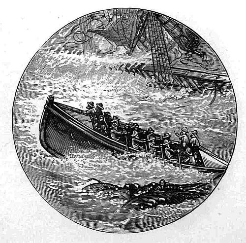 The yawl, having reached the brig, put three hands on board to navigate her into Yarmouth Harbour. She stood back for the shore. On passing the Newarp Floating Light, a signal was made requesting them to take a sick man on board, which they did, and then continued their cruise with a strong breeze, under three lugs. They were taking a snack of food, when, having imprudently trimmed the ballast to windward—a most dangerous practice—a tremendous squall took the sails aback, and in a moment capsized her. Brock being a good swimmer, struck out to get clear of his companions, his ears assailed by their cries, mingled with the hissing of water and the howling of the storm. After a moment or so he swam back to help an old man to get hold of a spar; he then himself got on the boat, and stood upon its side; but finding that she was gradually settling down, he again struck off. By this time he supposed that all his companions were lost; and he began to think of the awful position in which he was placed, the nearest land being fully six miles distant. He remembered that it was half-past six just before the boat went over, and that as it was now low water, the tide would be setting off the shore, making to the southward, and that, therefore, he must swim fifteen miles before the ebb would assist him. Just then, a rush horse-collar, which had served as a fender to the boat, floated by. He got hold of it, and putting his left arm through it, was supported until he had cut the waistband of his cloth trousers, which then fell off. He in a similar way got rid of his frock, his waistcoat, and neckcloth; but he dared not free himself from his oilskin trousers, fearing that his legs might become entangled. He now put the collar over his head, but although it assisted him in floating, it retarded his swimming, and he had to abandon it. He had gone some little distance, when he discovered one of his messmates swimming ahead of him. The wind having gone down, no cries were heard, and the moon shone calmly on the water. Ere long he beheld the last of his companions sink without struggle or cry. Should he give in also? Not for a moment would he yield to such a thought; and he prepared himself for the desperate struggle.