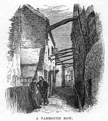 We had heard that Yarmouth was likened to a gridiron, and we now saw the reason. Comparatively few broad streets run north and south; they are, however, joined by one hundred and fifty or more narrow passages, called rows, which run east and west, like the bars of a gridiron. In many of them the houses project beyond their foundations, so that the inhabitants can almost shake hands with their opposite neighbours. Most of the rows are paved with pebbles brought up from the beach. Uncle Tom observed that the word “row” is probably derived from the French rue, a street. In many of them we observed curious pieces of old architecture. They are now numbered, but used to be called after the names of some of the principal inhabitants. One is called George and Dragon Row; and in it we noticed a somewhat tumbledown cottage, built in what is denominated the “herring-bone pattern;” the bones or frame being of wood placed in a zigzag fashion, filled up with masonry. Another row is Kitty Witches Row. One end is scarcely three feet wide. It is supposed that this row was inhabited by women, who used to go about at certain seasons of the year, dressed in fantastic fashions, to collect contributions. Yarmouth carts are formed probably after the model of the most ancient vehicles in the kingdom. They are long, narrow, and low, the wheels being placed under the seat, so as to occupy as little space as possible. The shafts are fastened to the axles, and two or three perpendicular pieces of wood—the hindermost being the longest—support the seat, on which a person can recline at his ease. It will thus be seen that wherever the horses can go, the cart can follow.