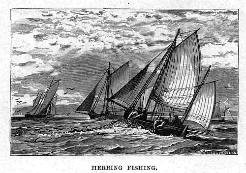 As is well-known, immediately the herring leaves the water it dies; hence the phrase, “dead as a herring.” To preserve the fish, salt is immediately thrown upon them in the boats; they are carried to the fish-house in open wicker baskets, called swills, where they are delivered over to a man called a “tower,” when they are placed on the salting floor. If they are to be used at home, they remain for only twenty-four hours; but if for the foreign markets, for several days. They are afterwards washed in fresh water, and strung up by splits passed through their gills, one tier below another, to about seven feet from the ground. Oak-wood fires are then kindled under them for fourteen days, if intended for the foreign market; but if for home use, only twenty-four hours. The first are called red-herrings, and the latter are known as bloaters. When sufficiently cured, they are packed in barrels, each containing about seven hundred fish. Between thirty and forty thousand barrels are sent to the Mediterranean, but a far larger quantity is used at home. Upwards of two hundred boats, carrying two thousand men, are employed in the herring fishery; but many more are engaged on shore in curing the fish.