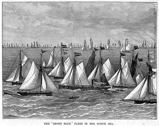 One of the masters of a lugger showed us the way the nets hang in the water; the whole train being extended in nearly a straight line, the big rope to which the corks are fastened being uppermost, and the body of the net hanging perpendicularly in the water, forming a wall of netting more than two thousand yards long and about eight yards deep. The strain from the vessel serves to keep the net extended, and the whole—vessel and nets together—drifts along with the tide.